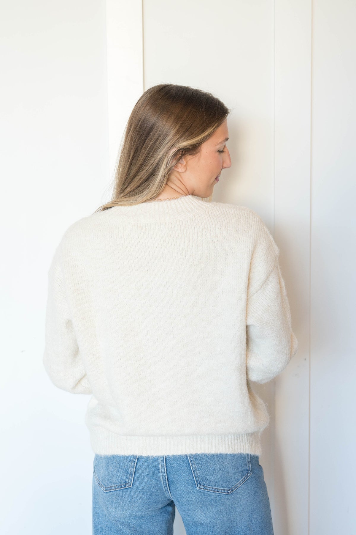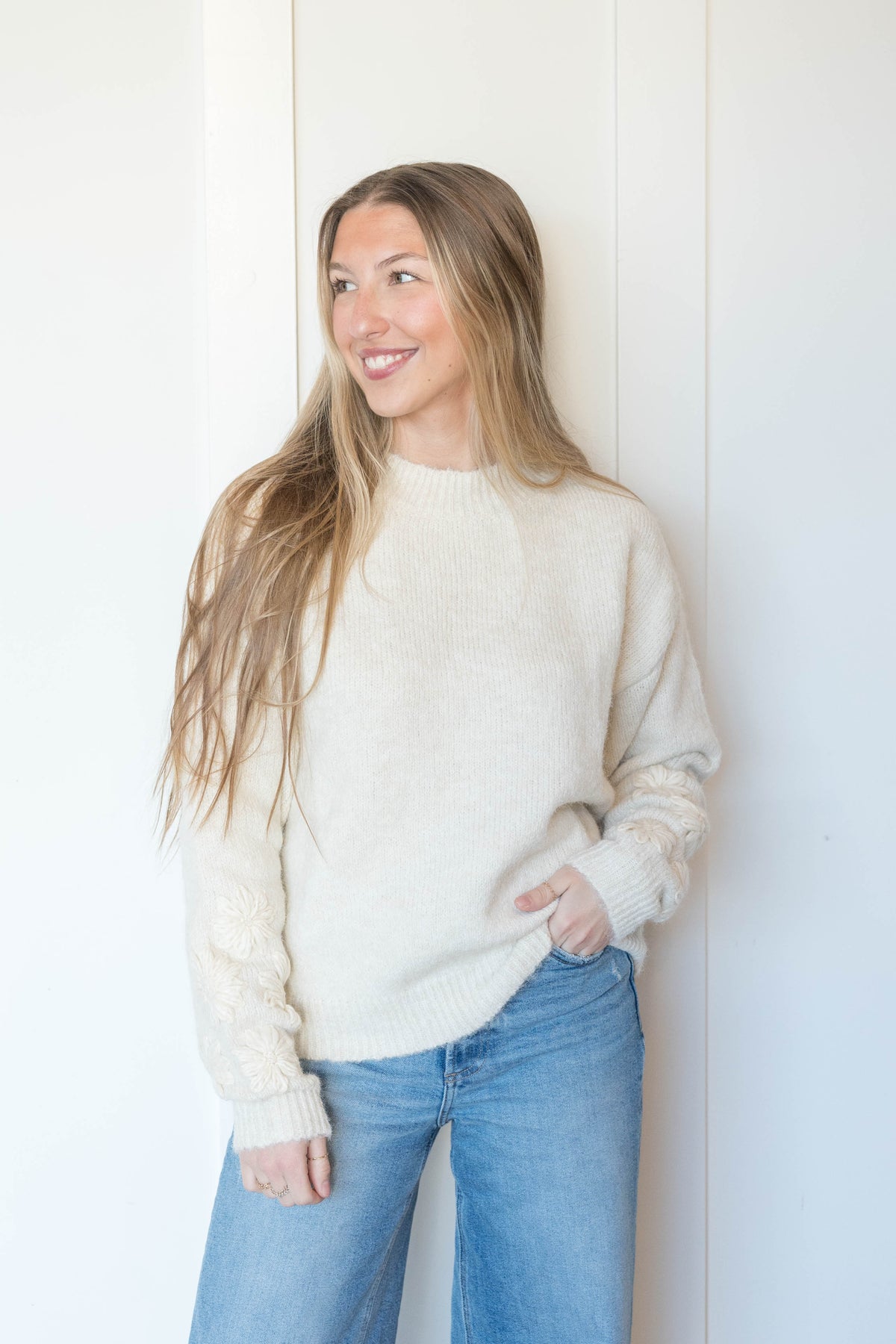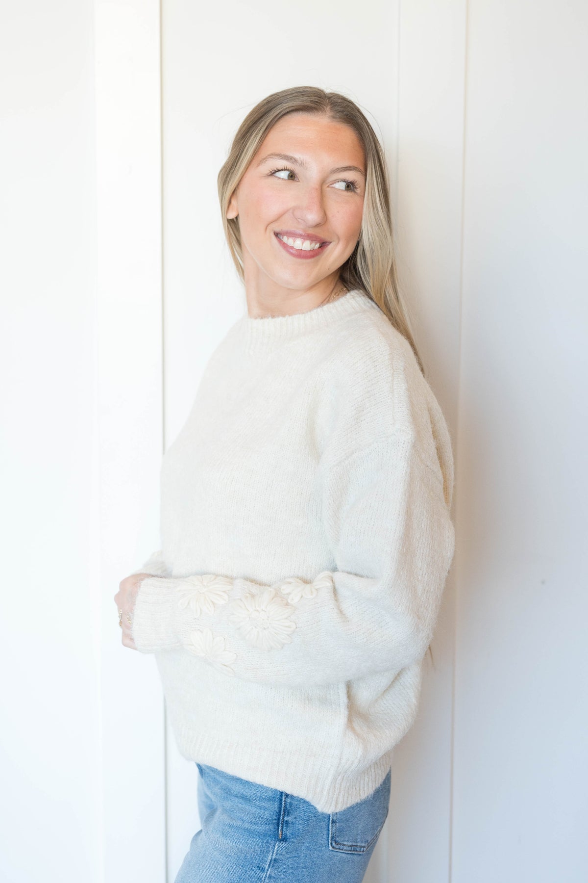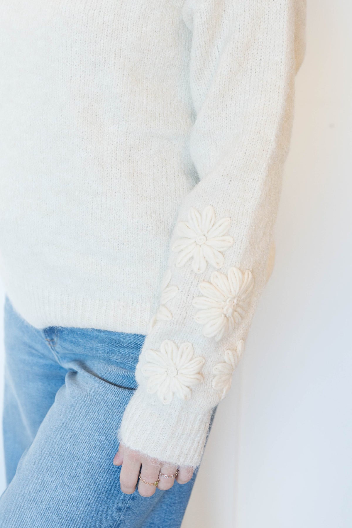 The Alannah sweater combines timeless elegance with artisanal detail. This crew neck style features delicate floral appliqué embroidery along the sleeves, adding a sophisticated botanical accent to an otherwise classic silhouette. Crafted for versatility, it transitions seamlessly from casual weekday wear to polished weekend styling. The thoughtful sleeve embellishment elevates the piece without overwhelming the design, making it an essential layering piece for any refined wardrobe.