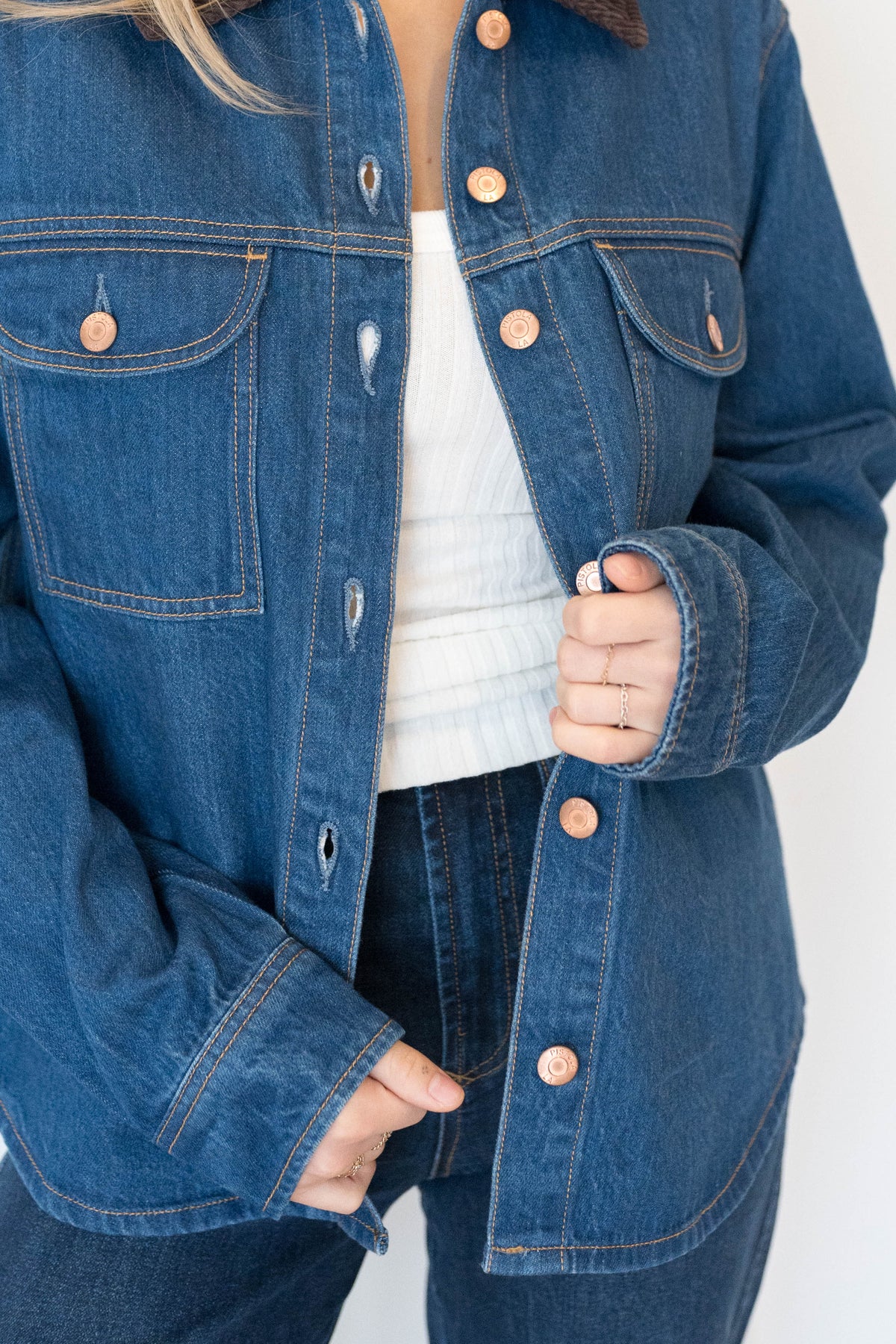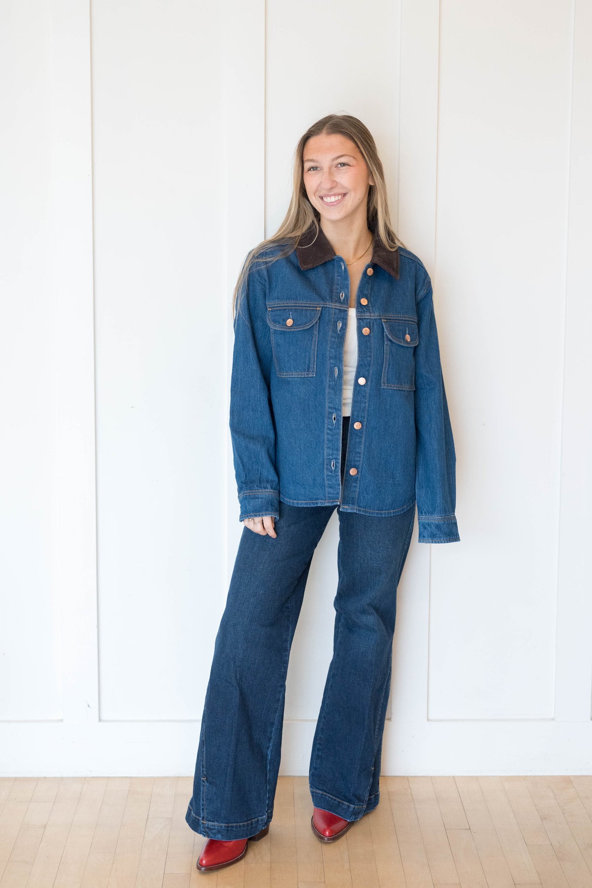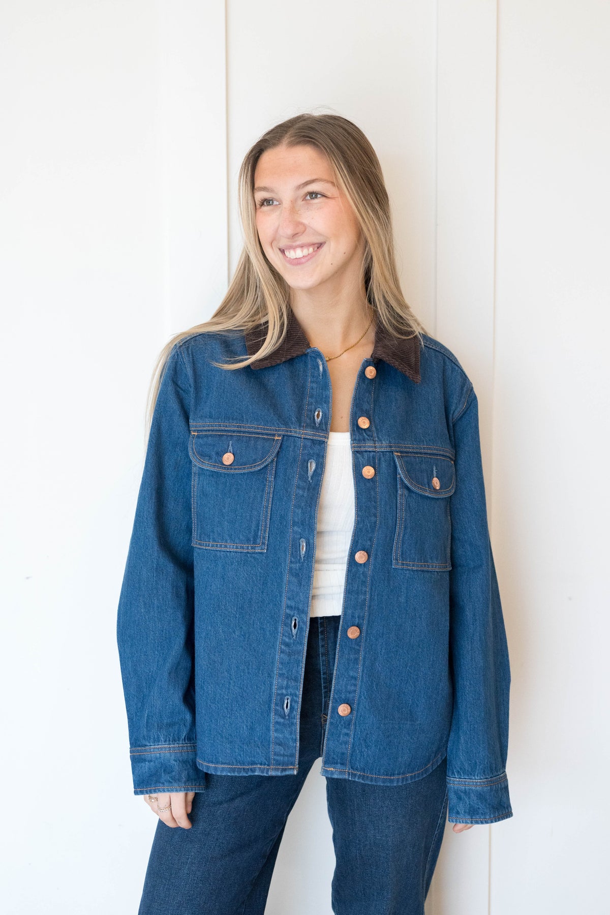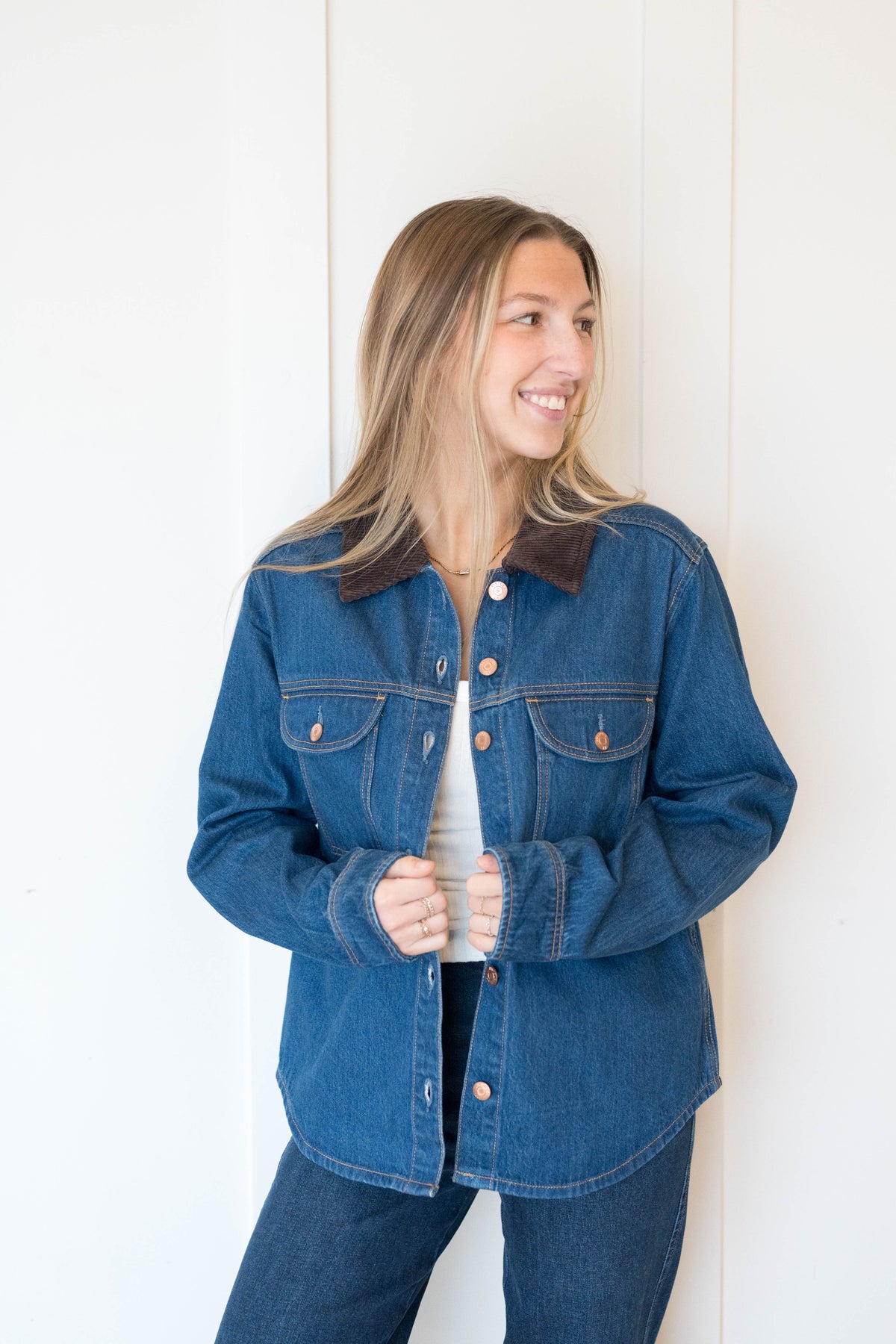 The layering piece you didn't know you needed. Devon delivers the perfect balance of shirt and jacket with a relaxed fit that feels effortlessly cool and never oversized. The classic button-up styling with a contrast brown corduroy collar brings utilitarian appeal while the comfortable proportions make it perfect for layering or wearing solo. Crafted from premium denim in Infinity, a rich blue wash.