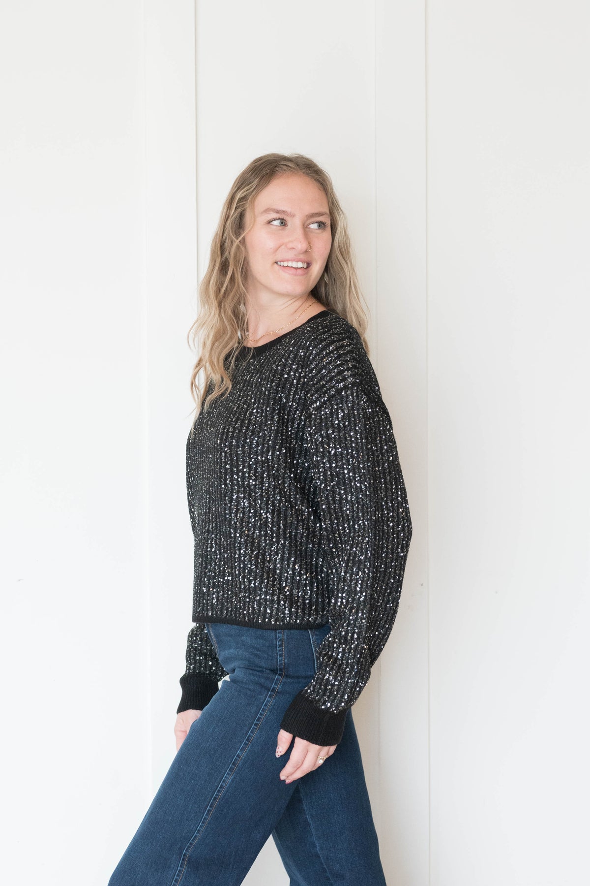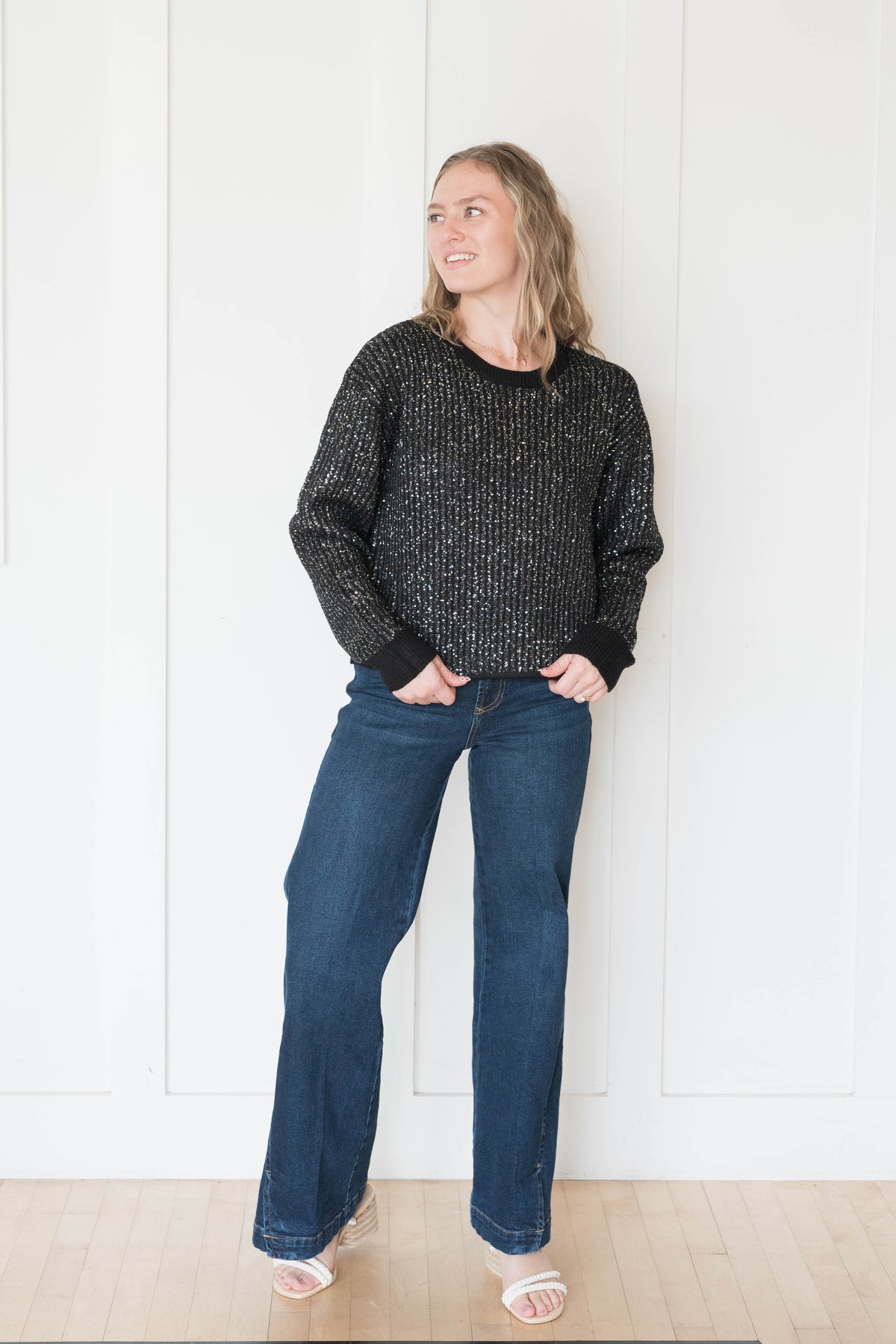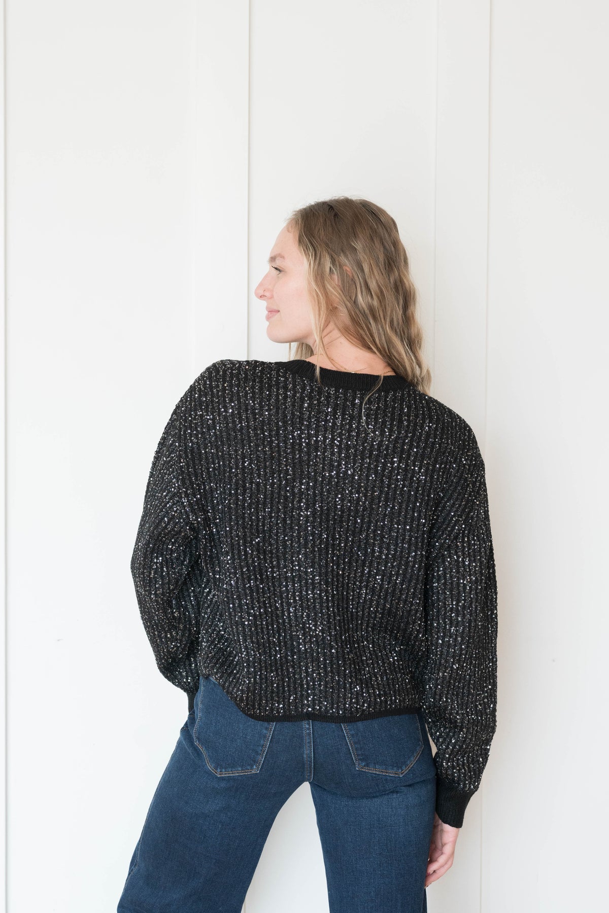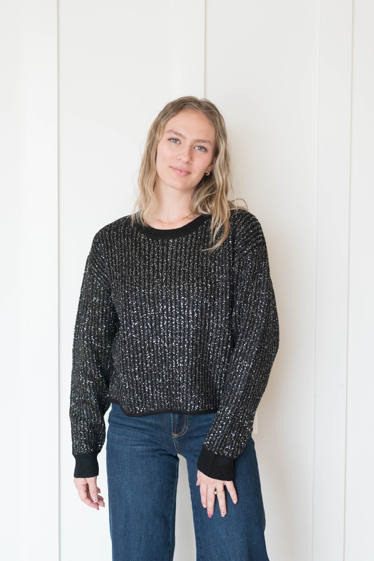 Designed to shine, this lightweight crewneck sweater is knit with shimmer yarns for a subtle sparkle. A relaxed fit keeps it wearable, making it perfect for holiday nights or casual glam moments.