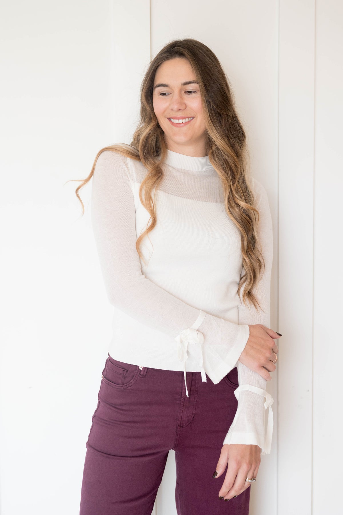 This top is crafted from a soft, fine-gauge knit in a beautiful ivory color. It features a sheer mesh yoke and sleeves that are adorned with small, rosette-like floral appliqués. The knit body provides comfort and coverage, while the sheer details and florette cuffs add a romantic and elegant touch.