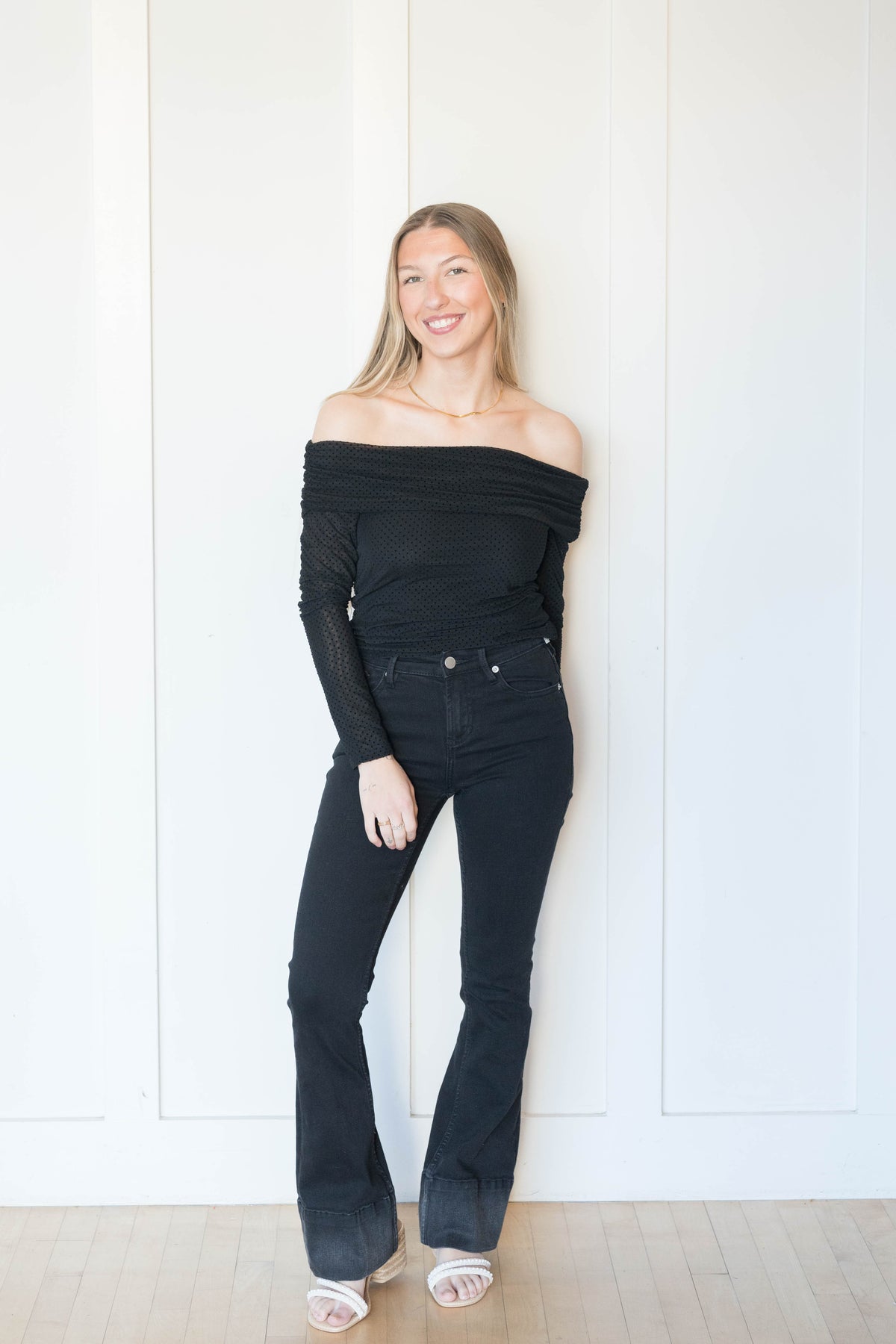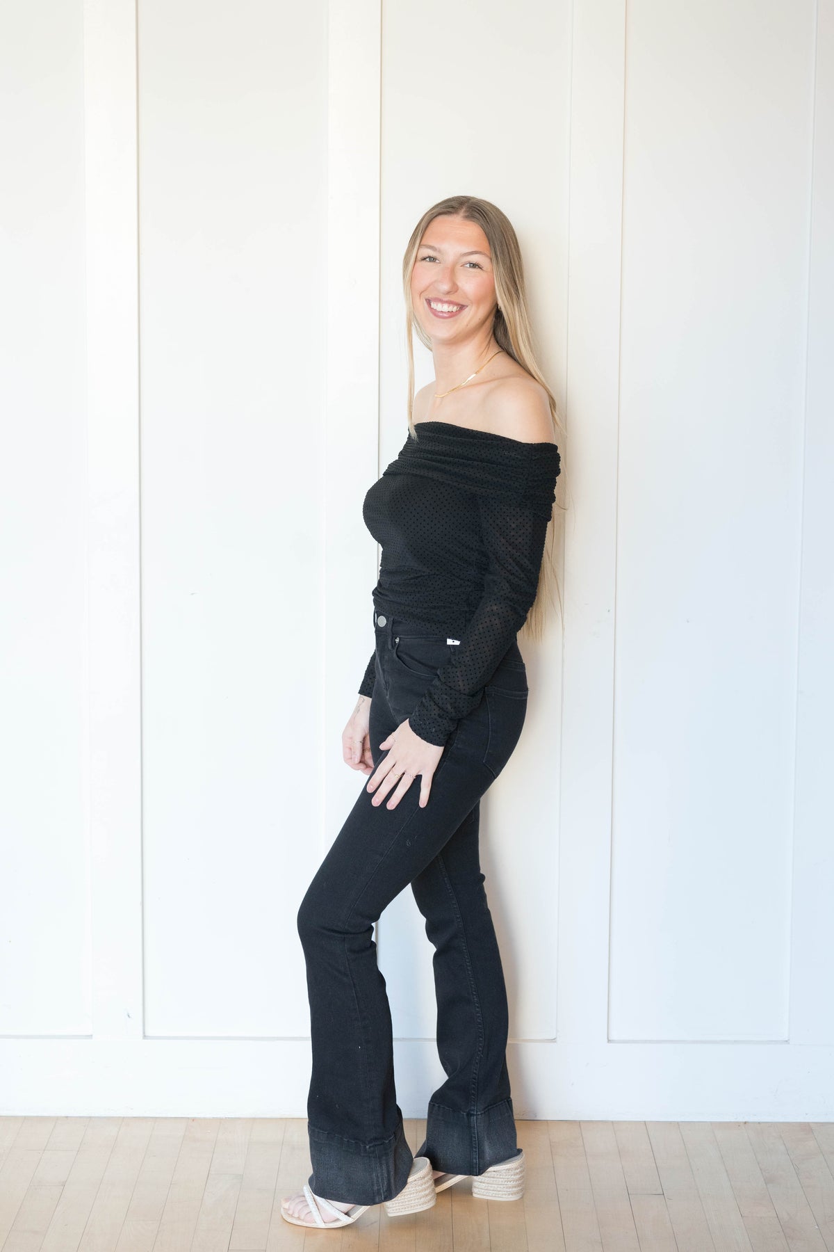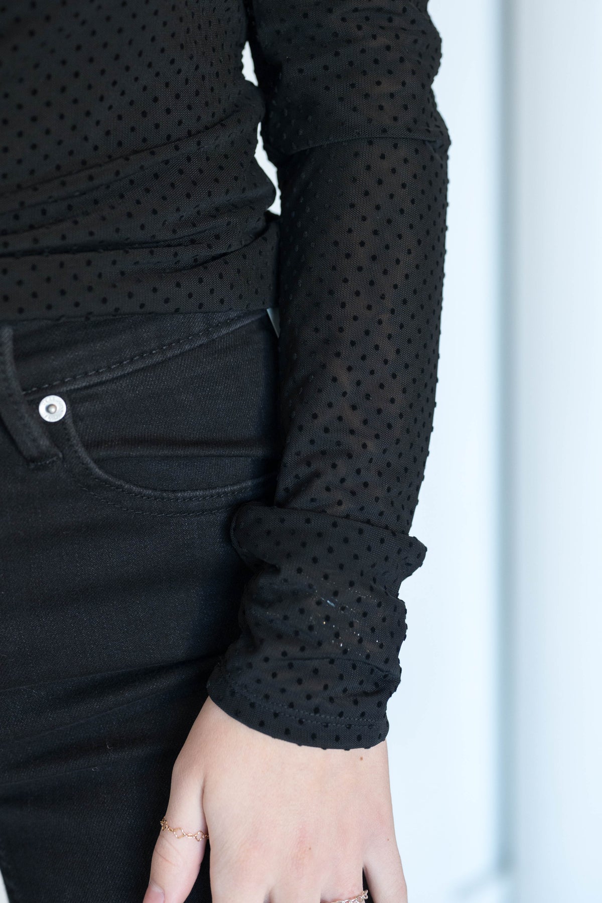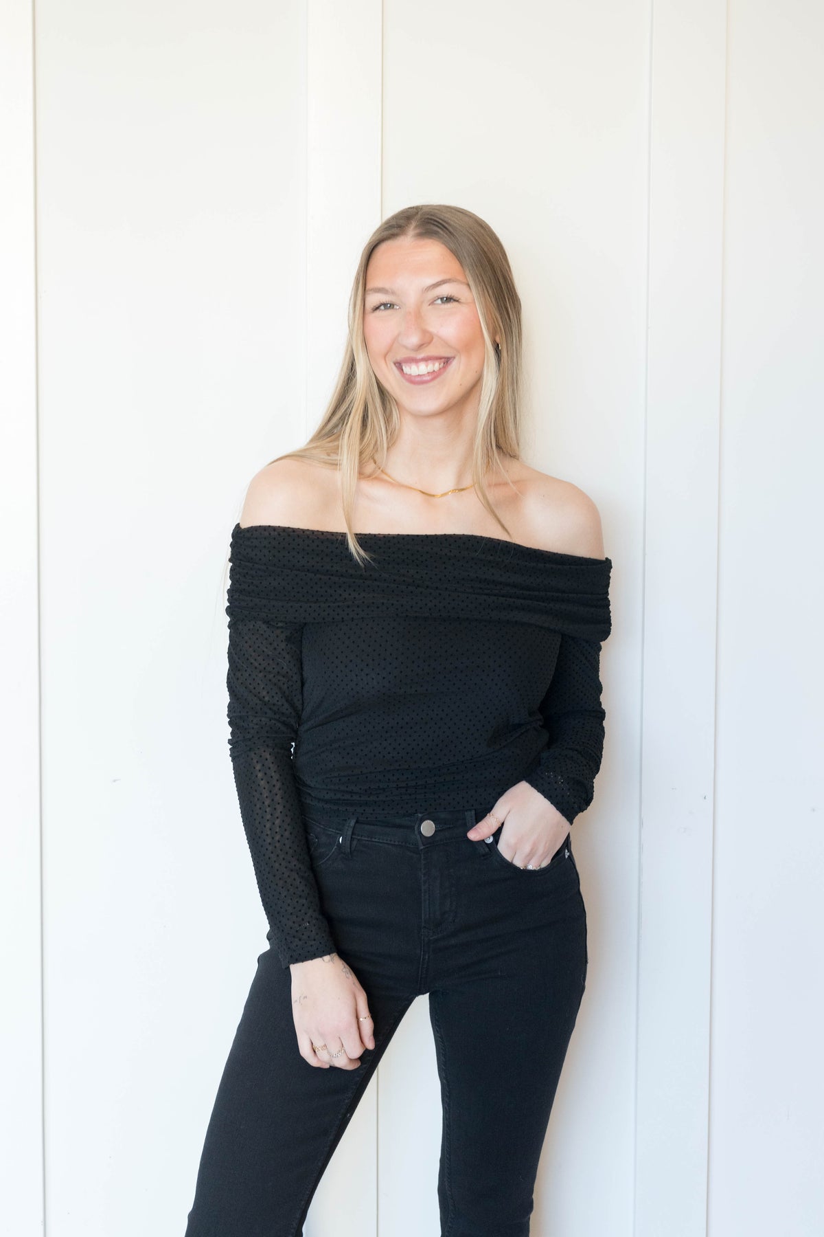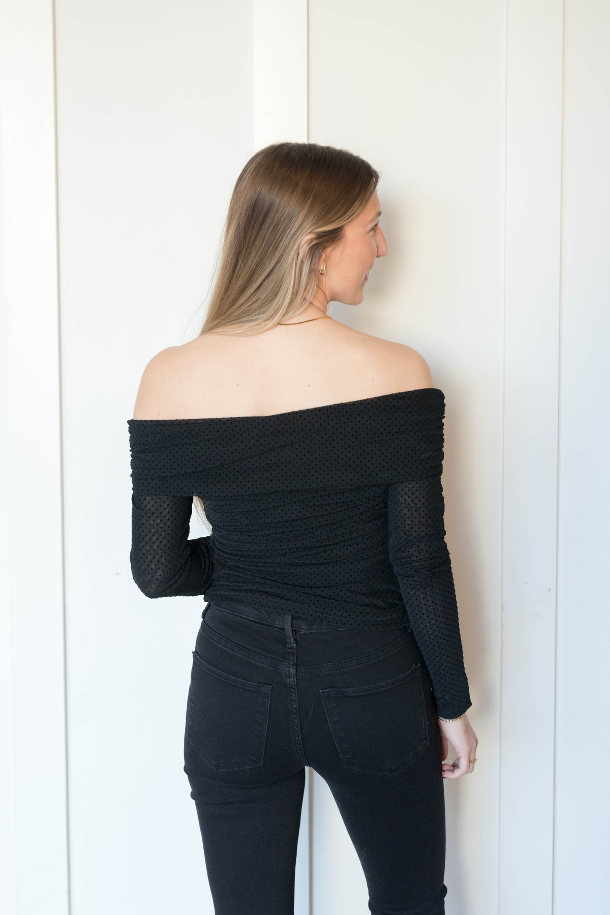 This off-shoulder top blends sheer mesh with flocked dots for an elevated, feminine look. The fitted silhouette feels lightweight and flattering, whether paired with denim or something dressier.