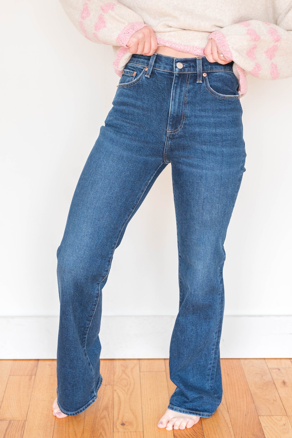 The slim boot that flatters every frame. Evie Petite sits at a high rise with a slim fit through the hips and thighs before opening to a subtle bootcut, creating long, lean lines with just the right amount of flare. The full-length 30" inseam elongates the silhouette, making it endlessly versatile for heels or boots. Crafted from comfort stretch denim in Penthouse, a dark indigo wash with refined fading that adds depth and sophistication.