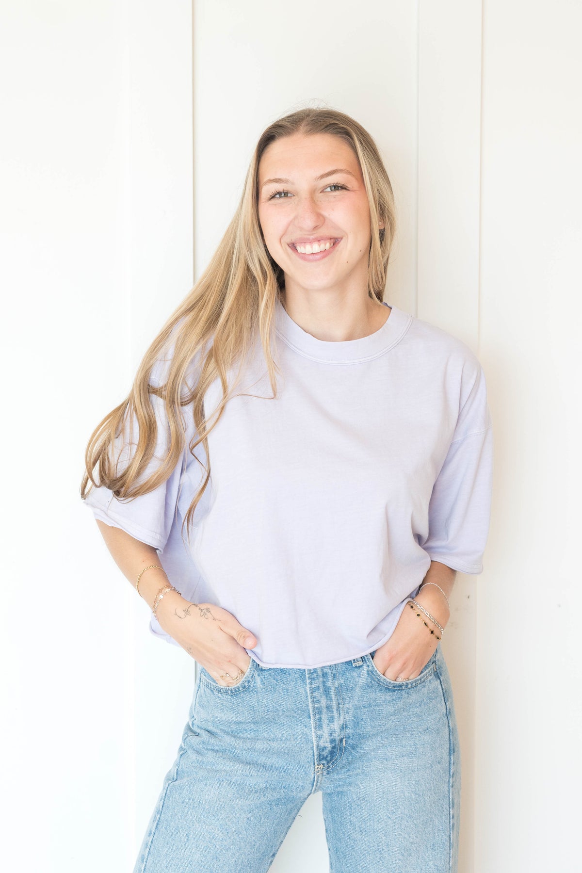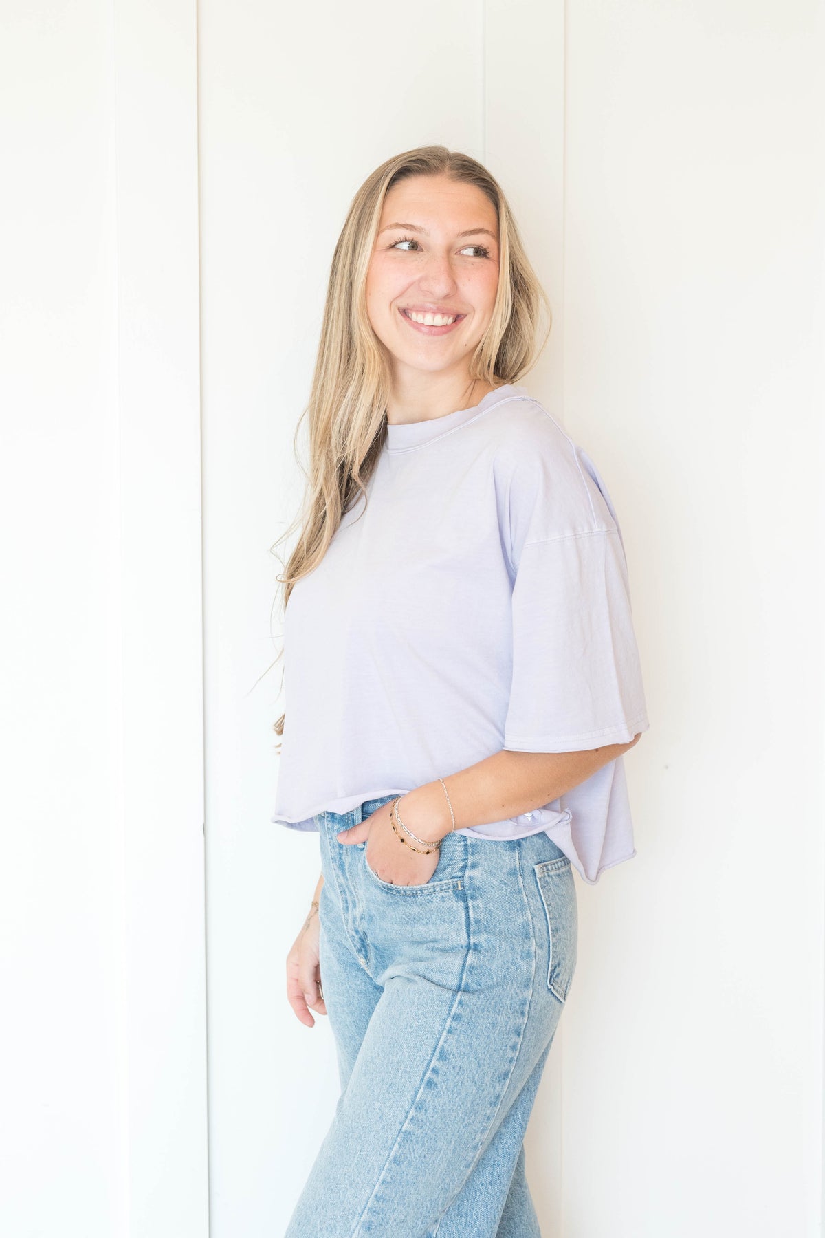 Warm up or cool down with this essential tee, featured in an oversized boxy fit and cropped design with raw-edge seaming throughout for a lived-in look.
