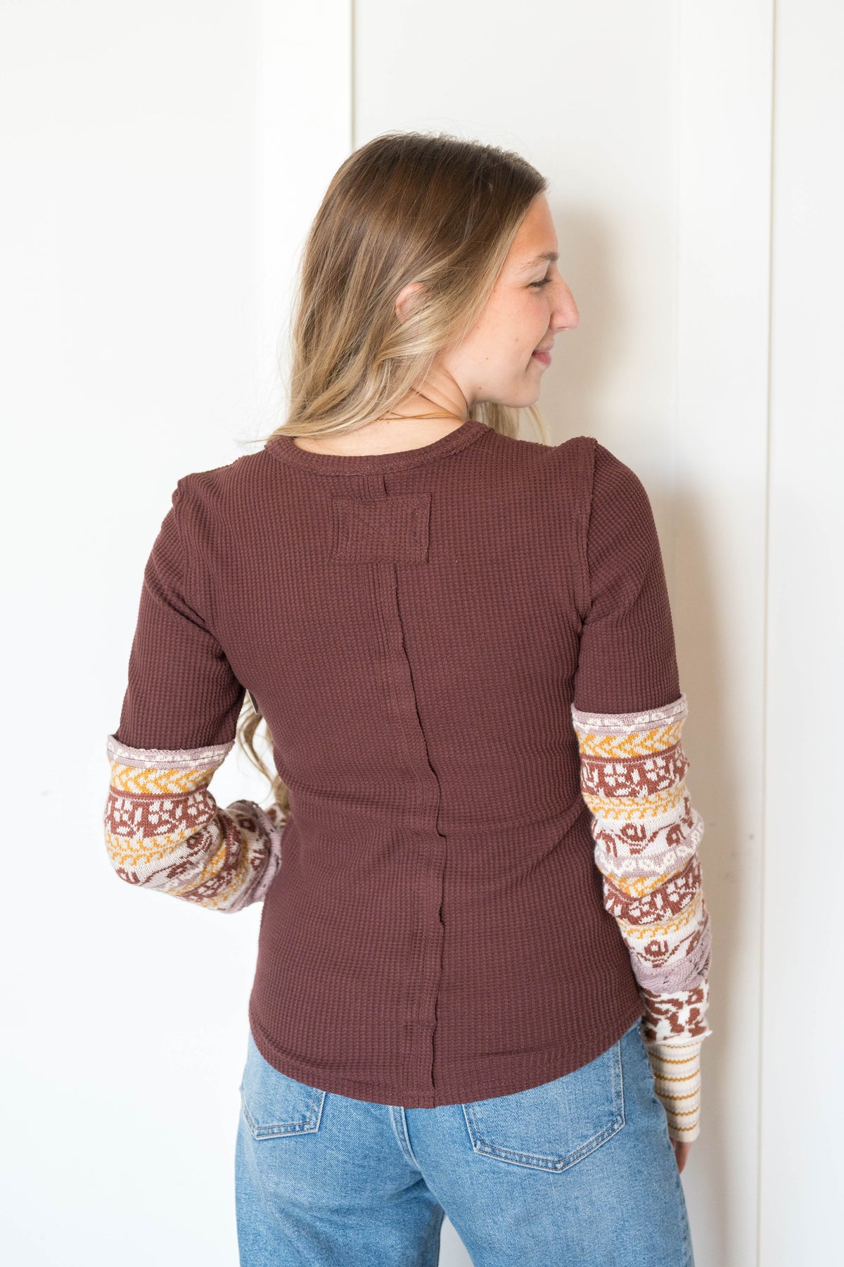 Cuffing season is finally here. This top from our We The Free collection features a relaxed fit and long-sleeve style with exaggerated printed cuffs and thumbhole detailing.