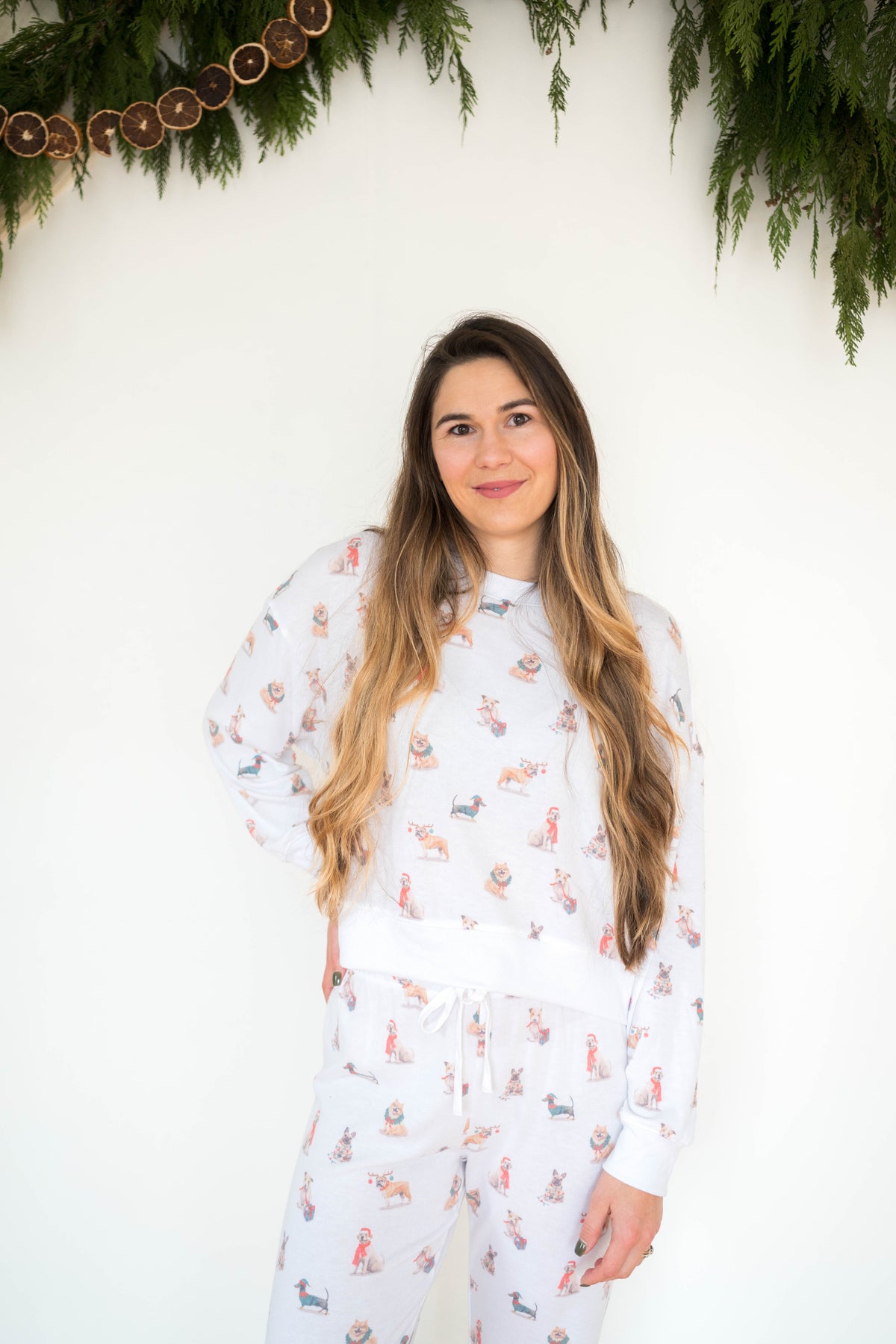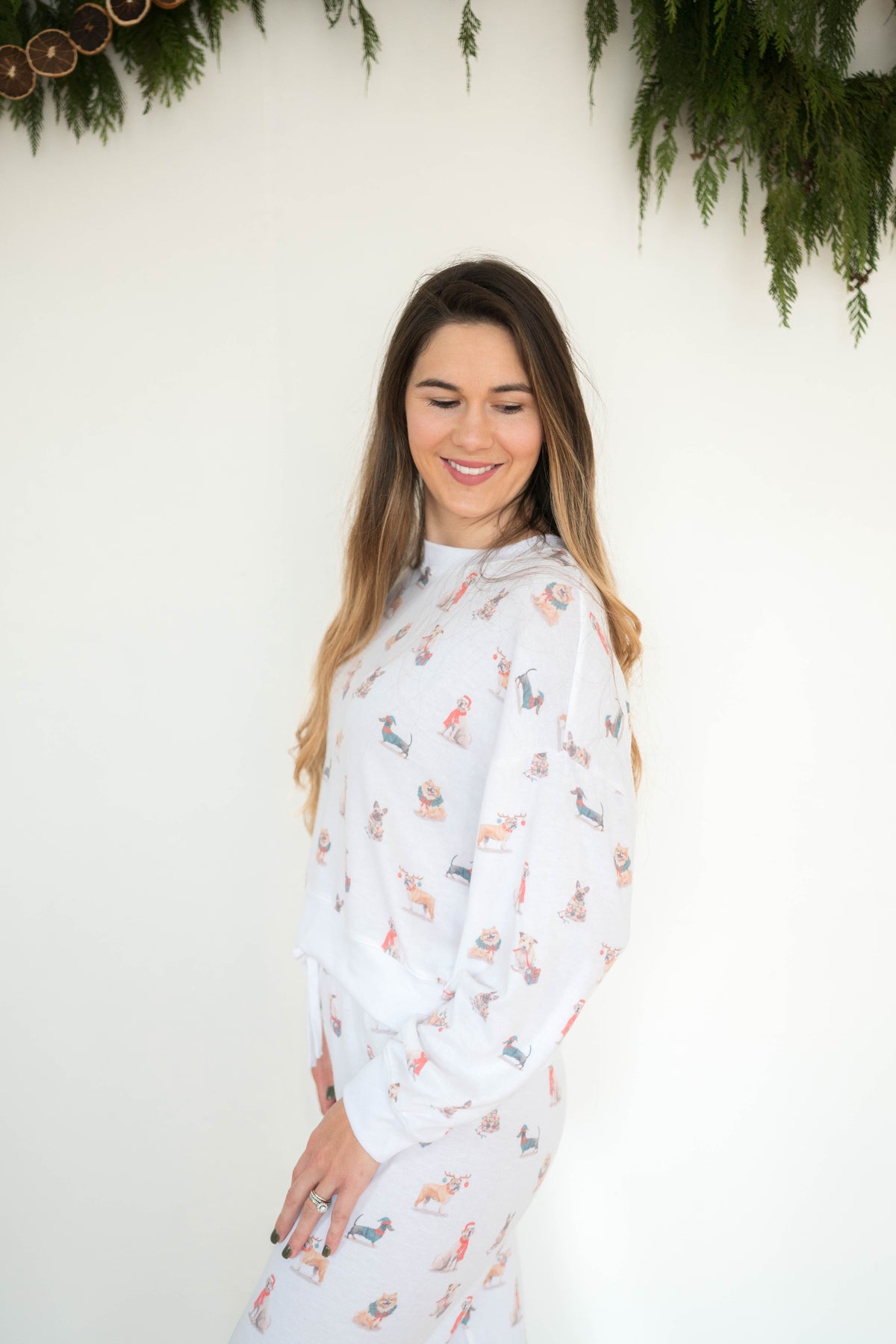 Our brushed sweater knit gives this long sleeve its soft, cozy feel. A relaxed fit makes it perfect for curling up at home while the adorable pup print brings a playful touch.