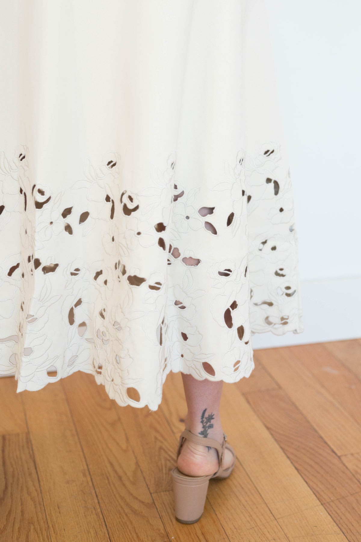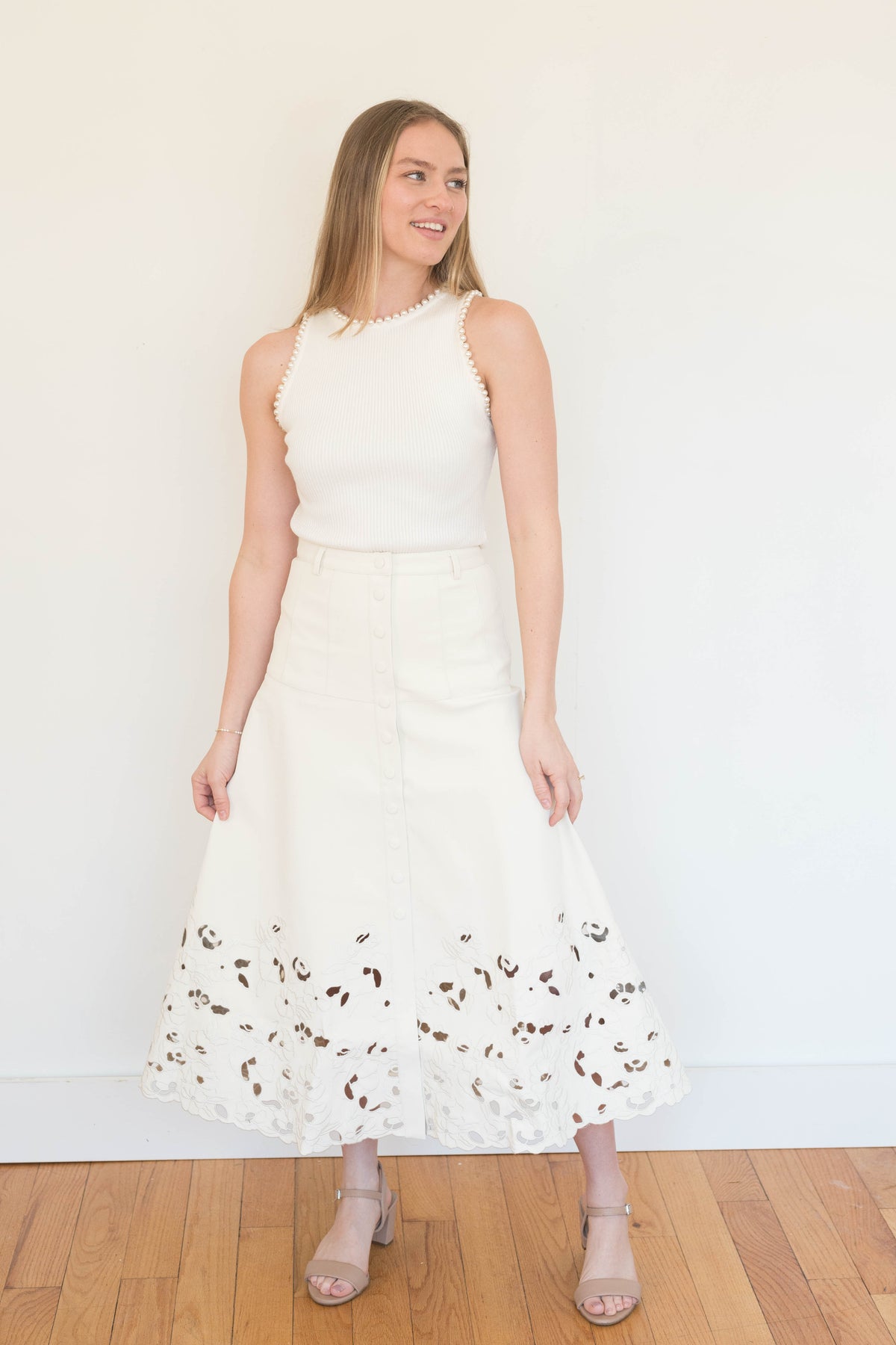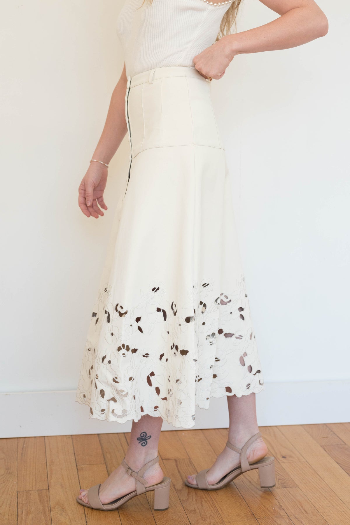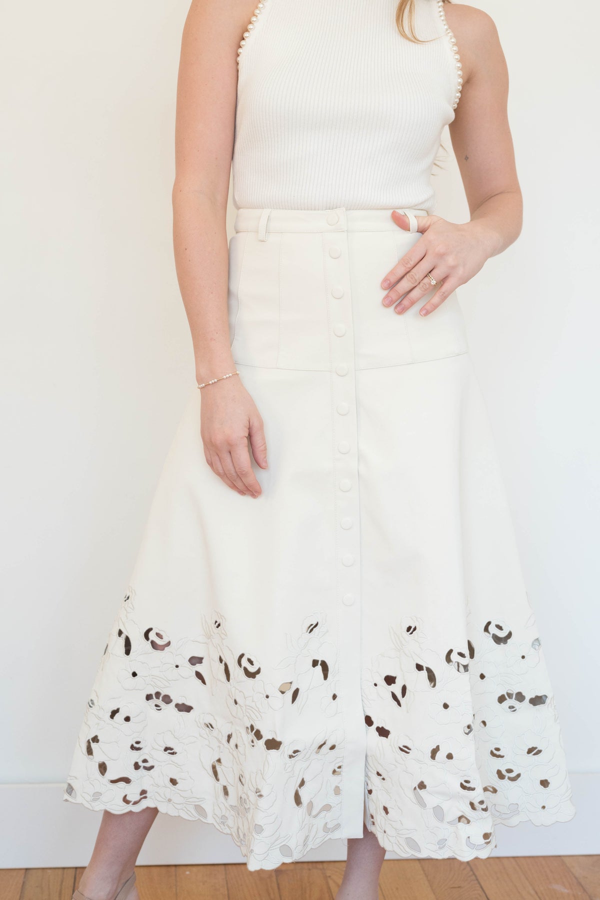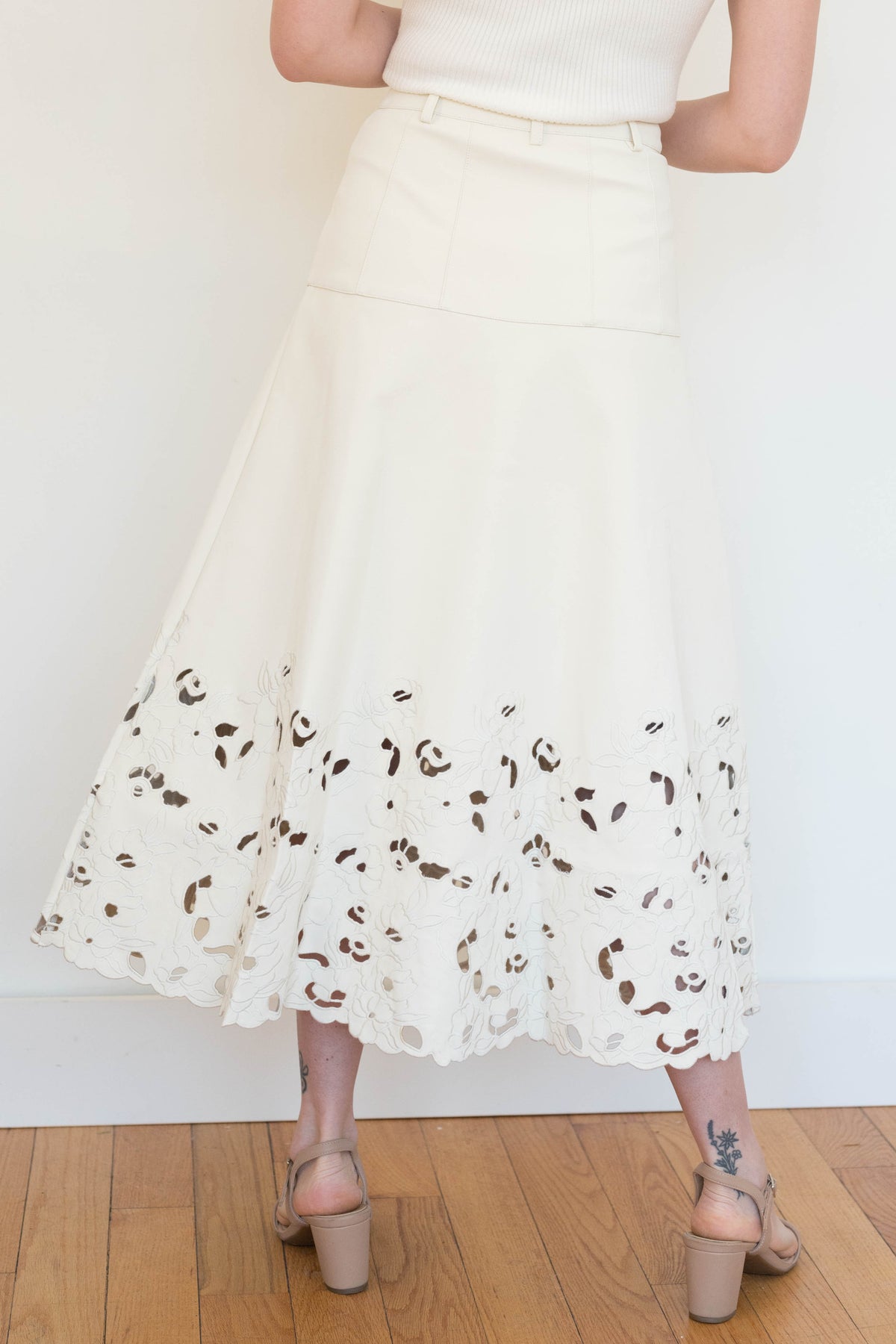 Paneled Structured Midi Skirt With Laser Cut Embroidered Hem