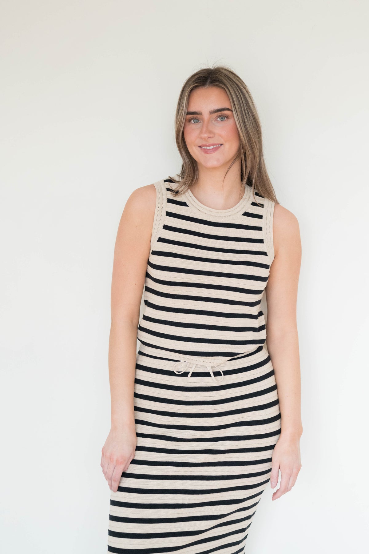 This crewneck tank makes getting dressed a breeze. The cool stripe and textured fabric make it versatile. We love it paired with its matching skirt for a complete look.