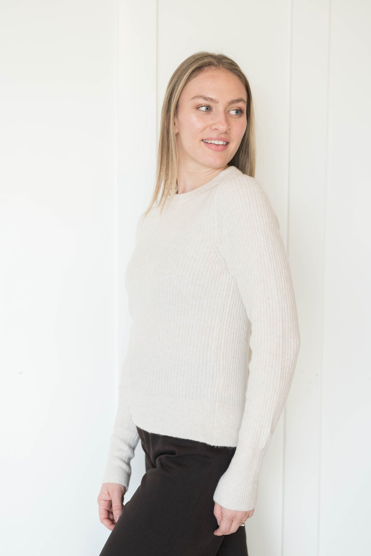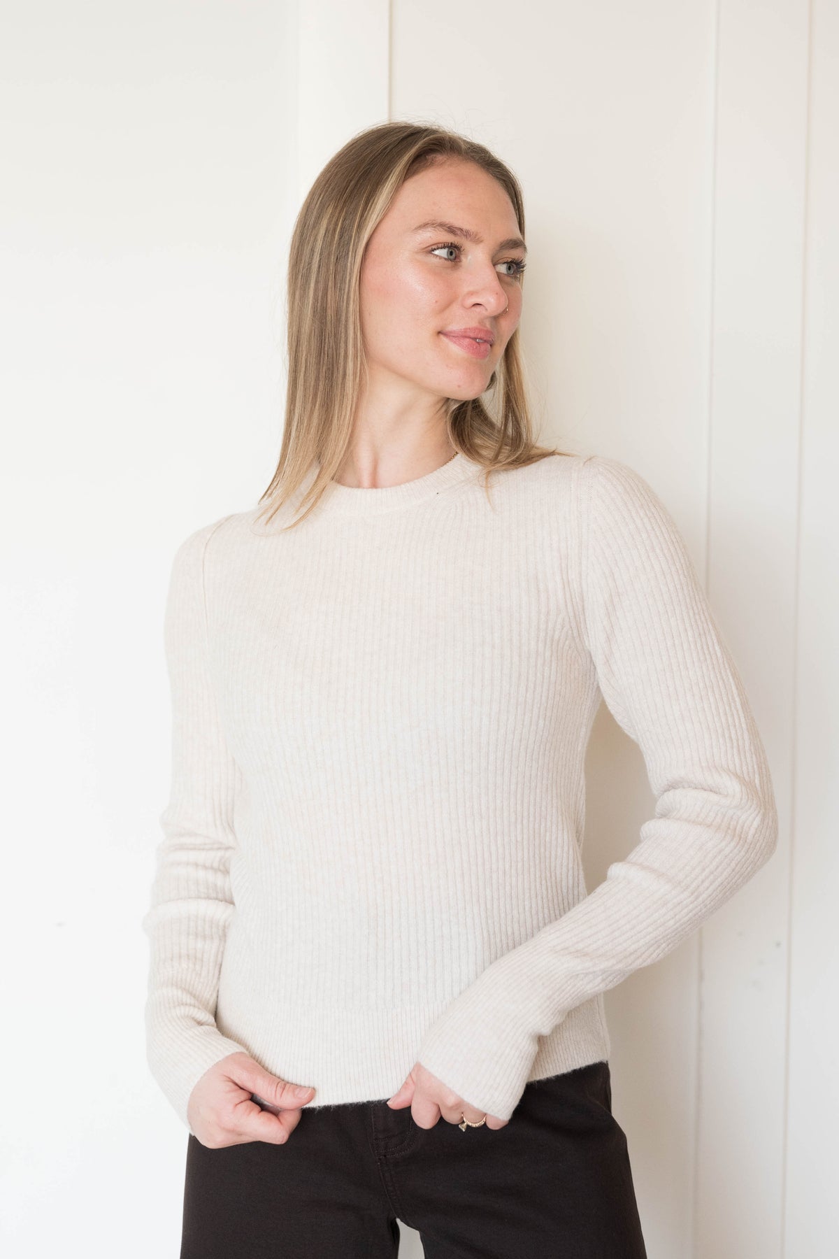 Your next everyday essential, this staple pullover features a ribbed knit fabrication and a fitted silhouette for the perfect throw-on style.