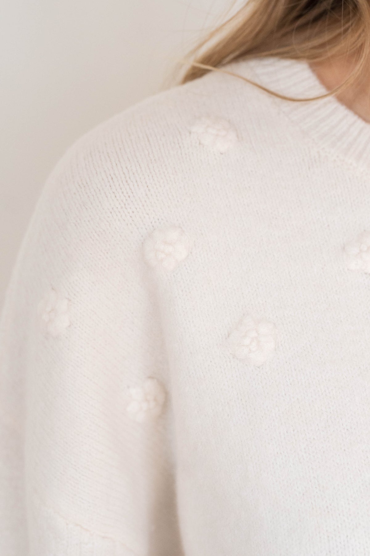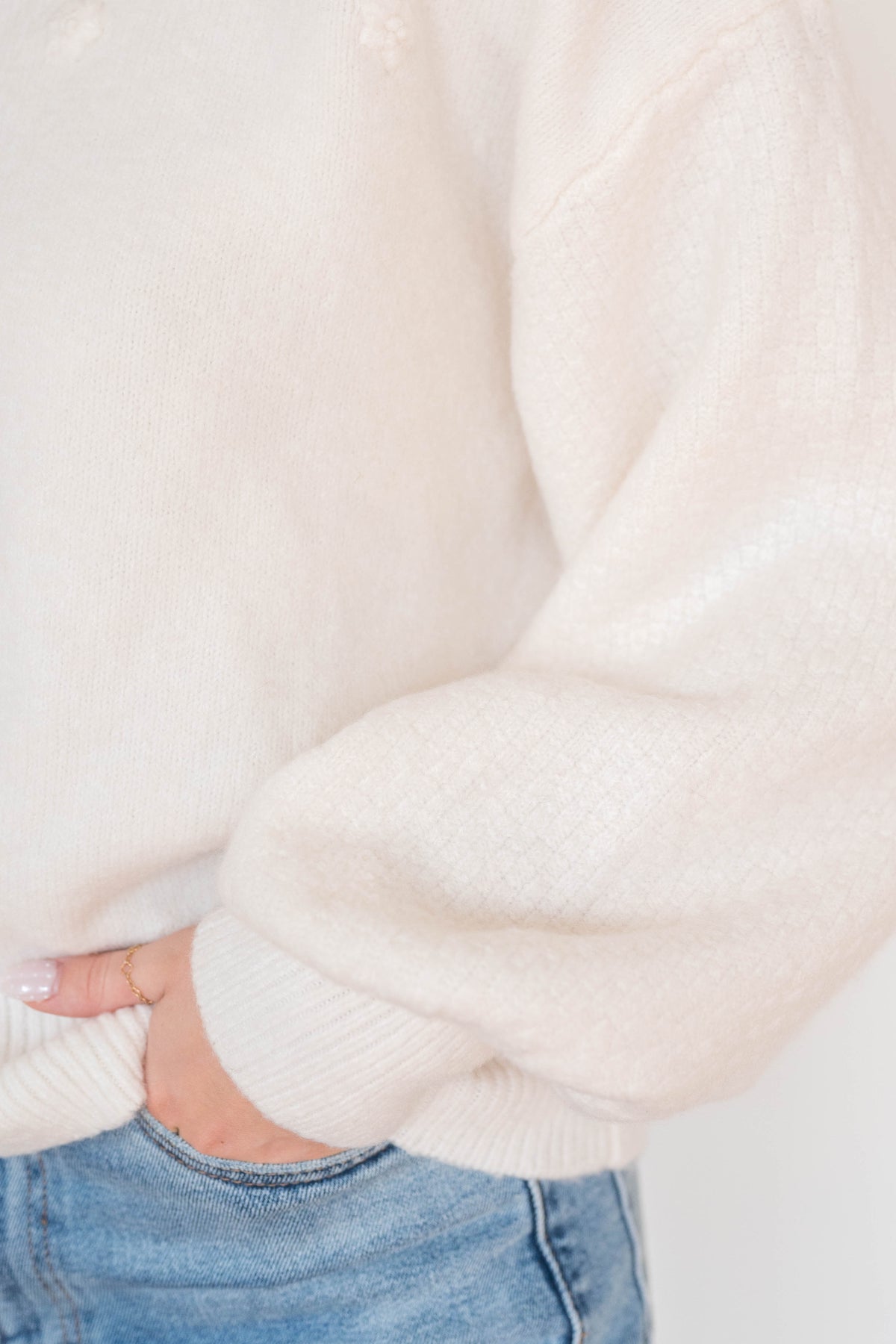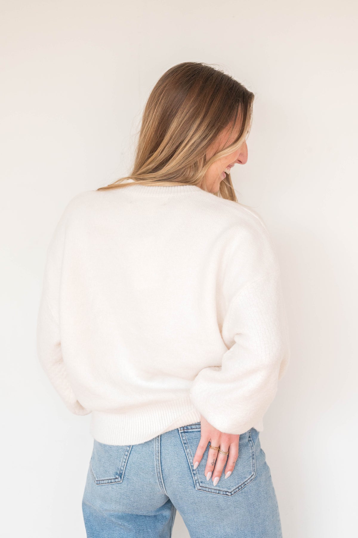 The Fawna Sweater is a classic white staple with vintage charm, featuring a high neckline and elegant gigot sleeves.
