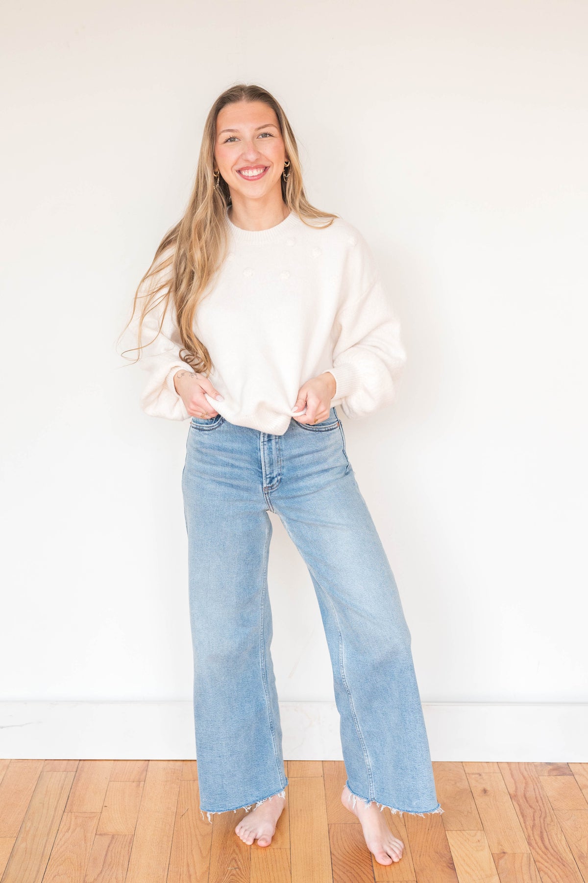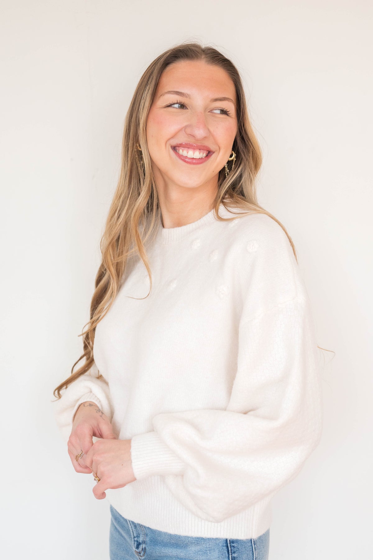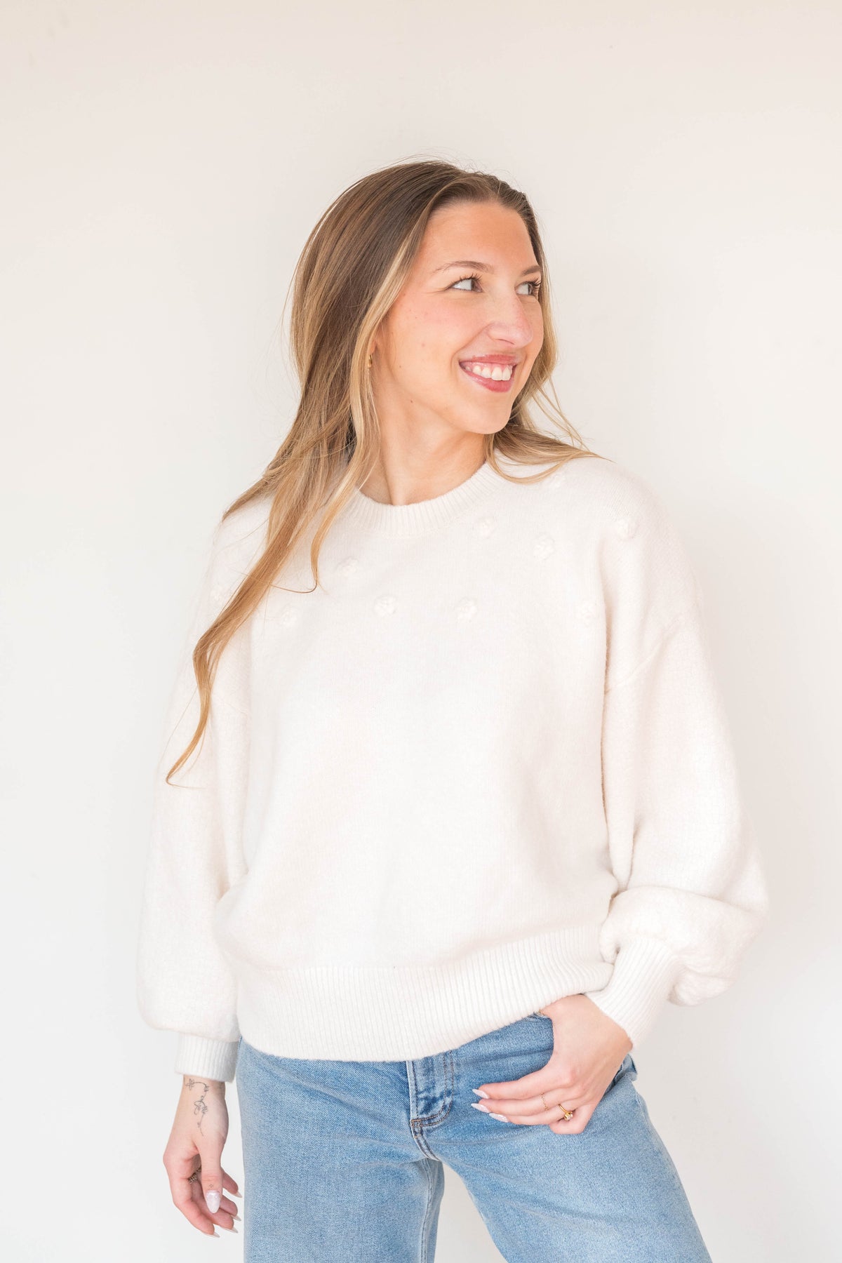 The Fawna Sweater is a classic white staple with vintage charm, featuring a high neckline and elegant gigot sleeves.
