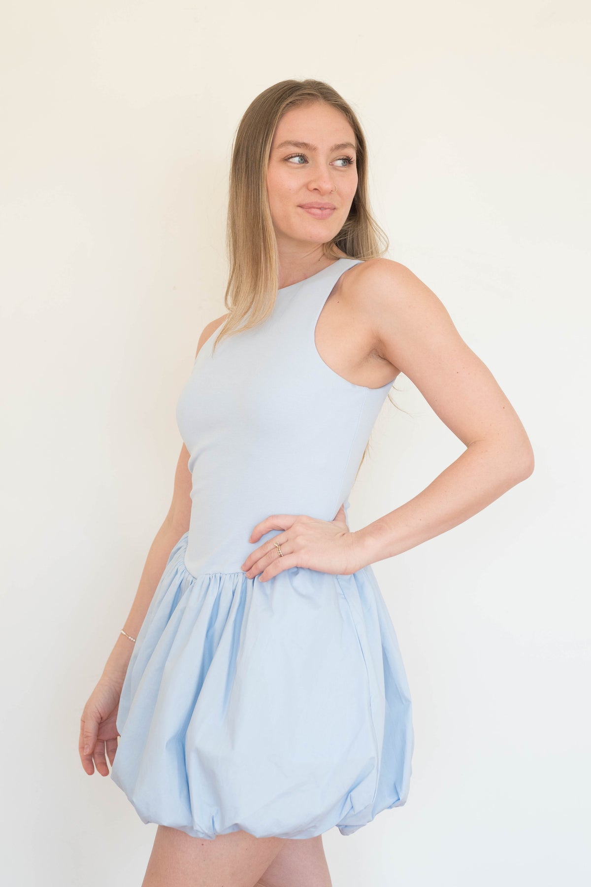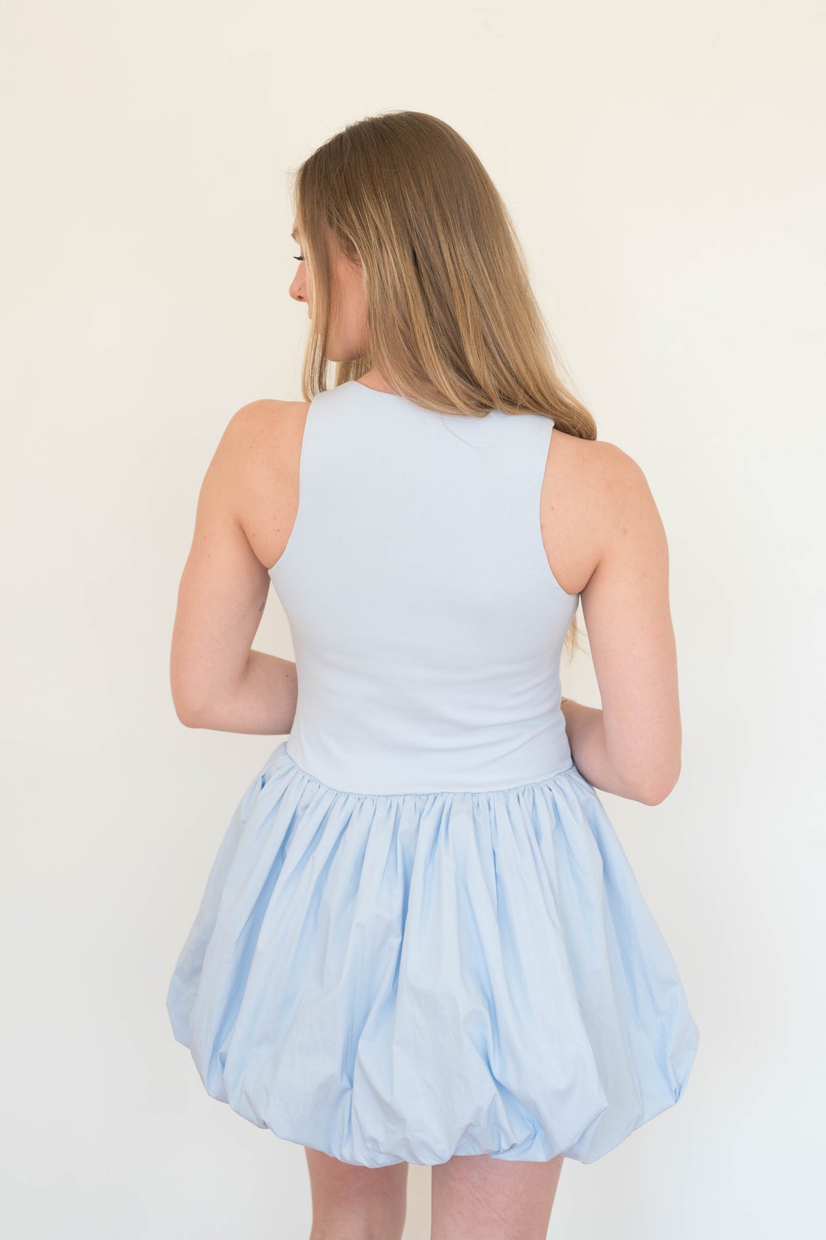 Light as air and brimming with whimsy, this mini dress is designed for the dreamer who loves to make a statement. The sleek, fitted bodice creates a clean, modern silhouette, while the voluminous bubble-hem skirt adds playful drama and movement.