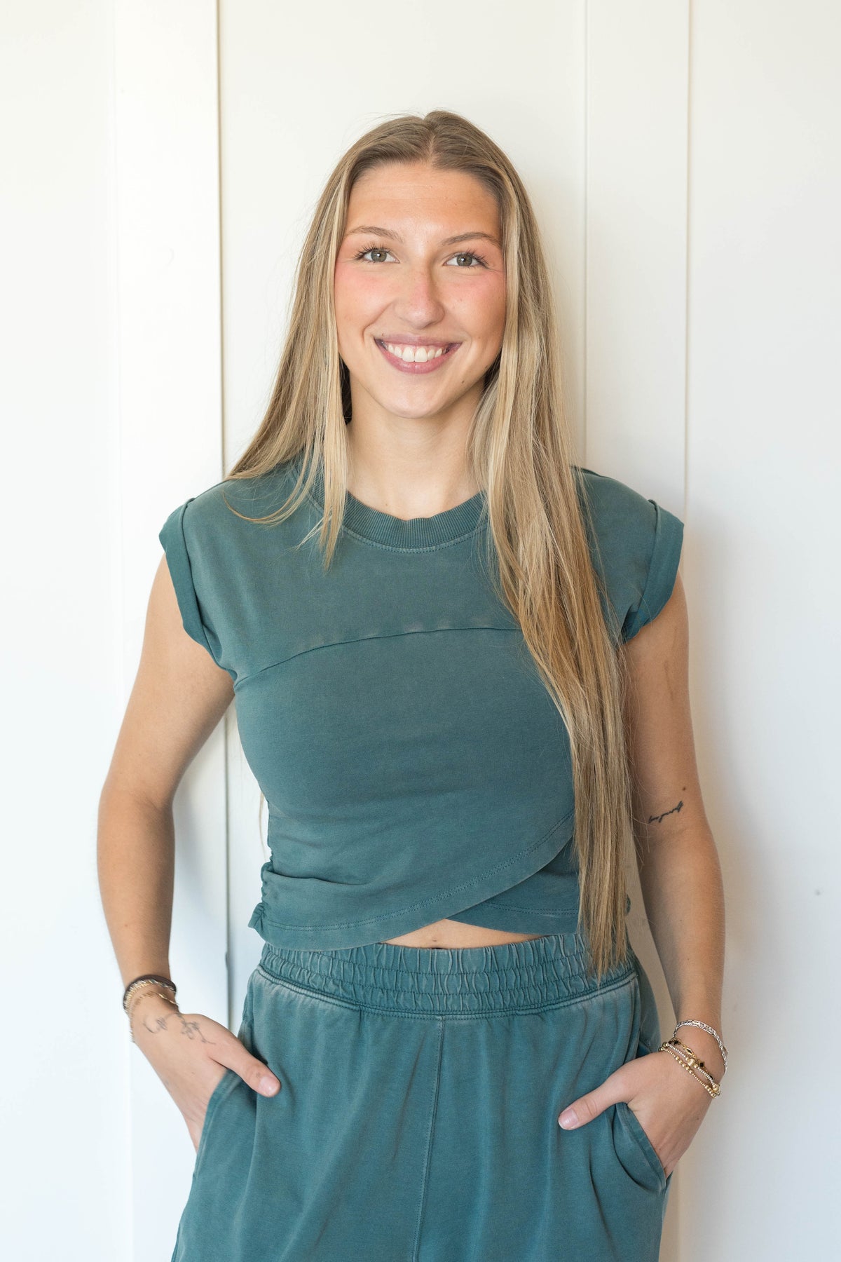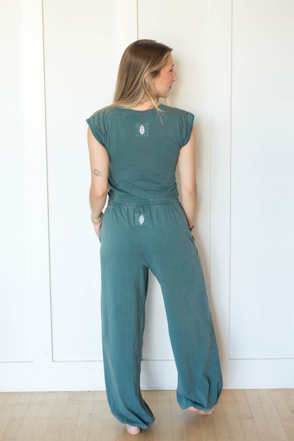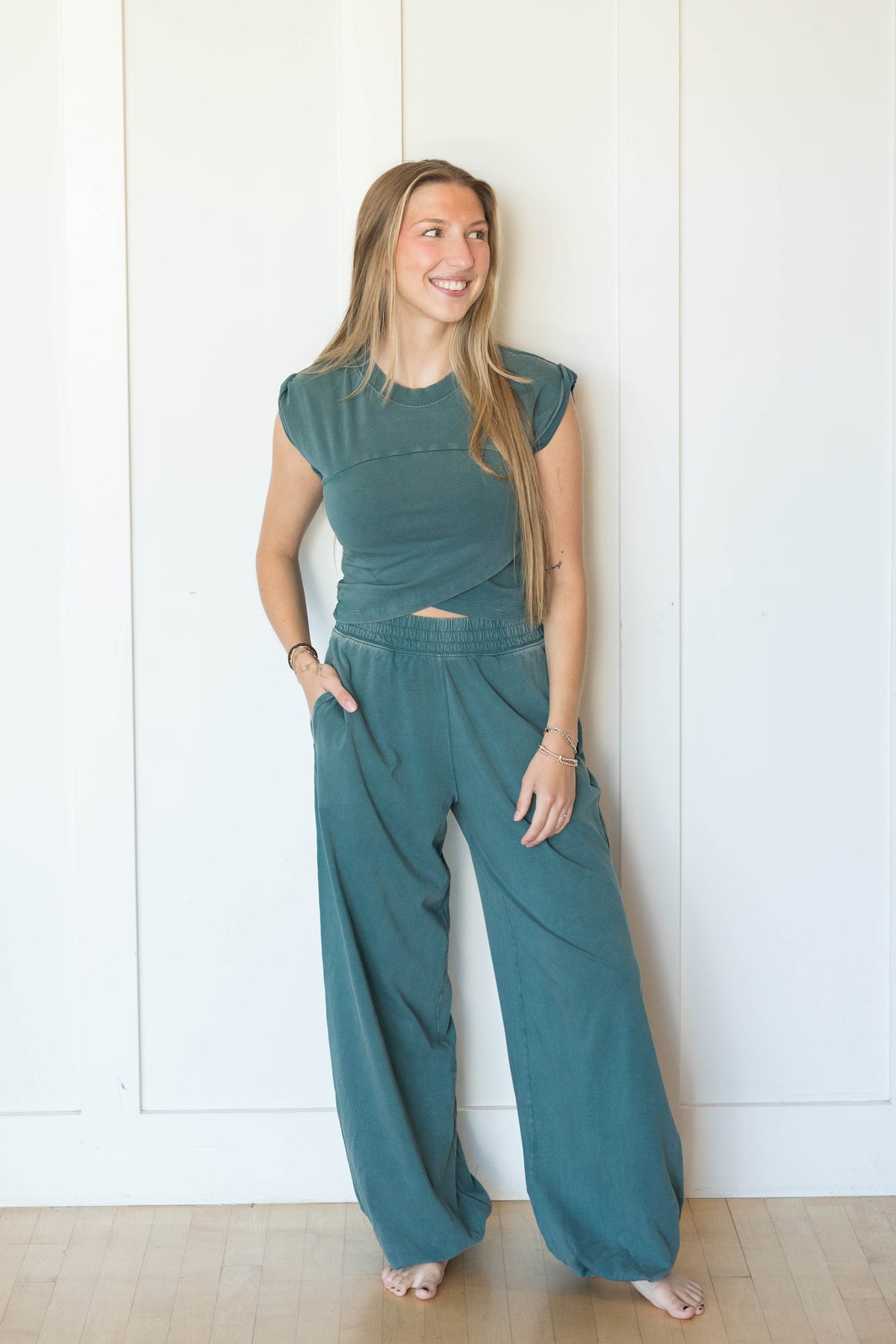 Features: Soft, jersey fabrication; relaxed fit; cropped muscle tee top with seaming detail; ankle length pant with high-rise waist and wide leg; elasticated waistband and cuffs; crossover detail on top; ribbed collar; side seam pockets