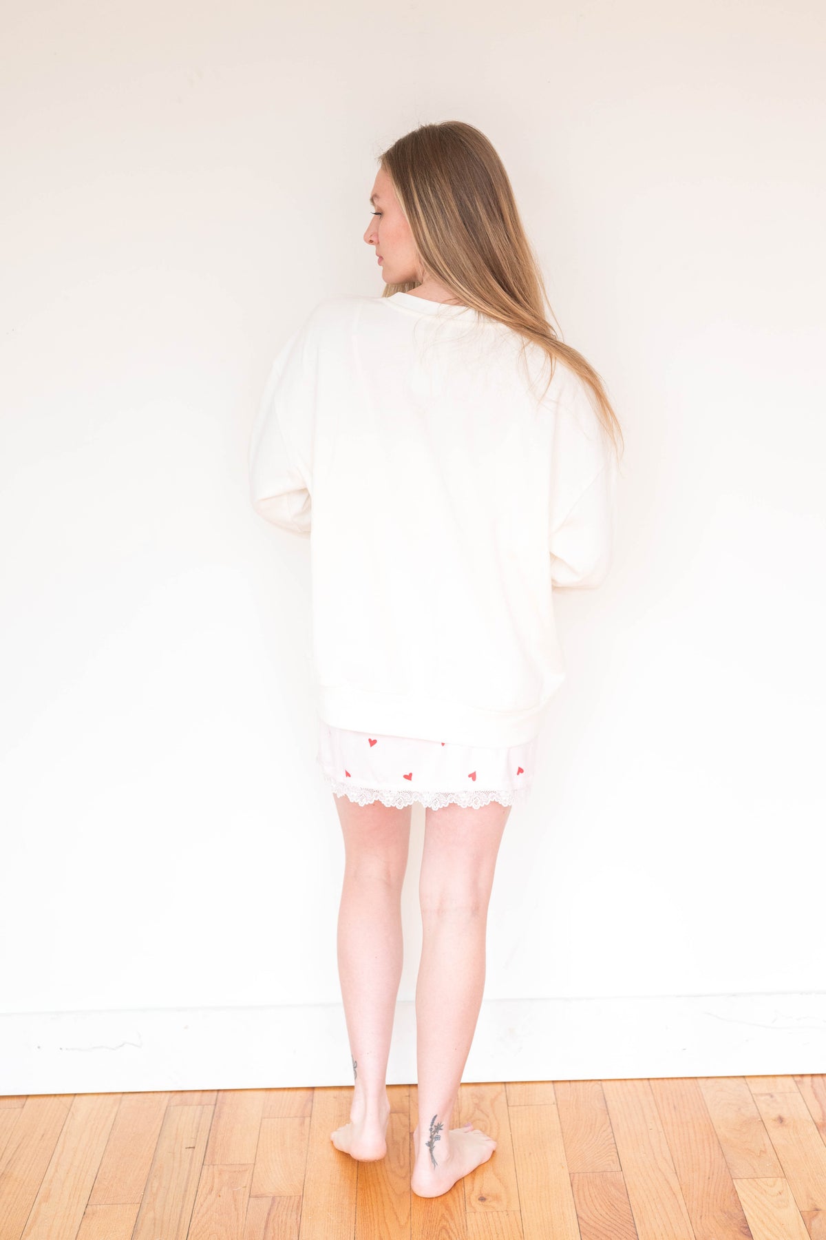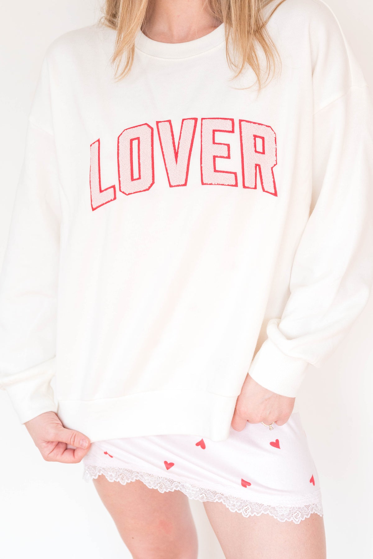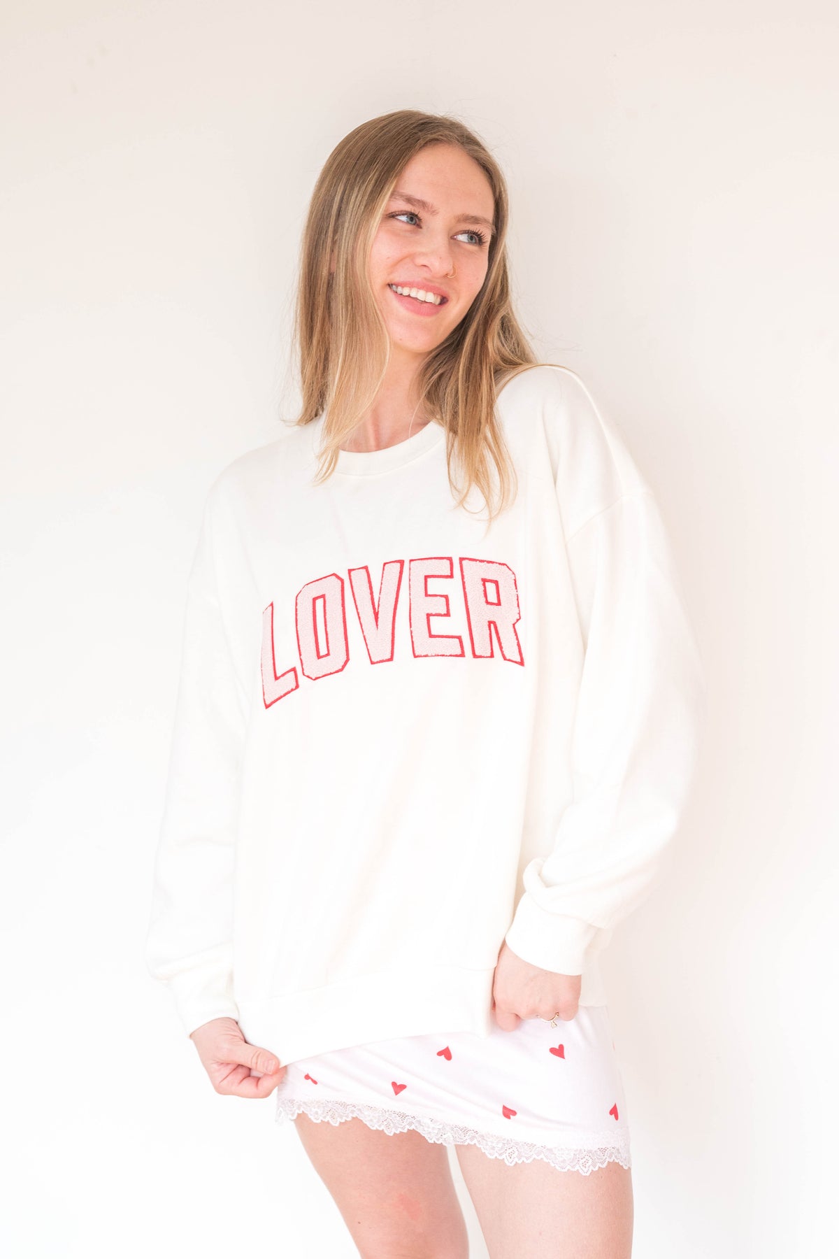 Designed with an oversized fit and soft cotton-blend fleece, this crewneck brings all the cozy vibes. The boucle “Lover” varsity lettering adds a romantic touch, making it perfect for lounging or layering on cool days.