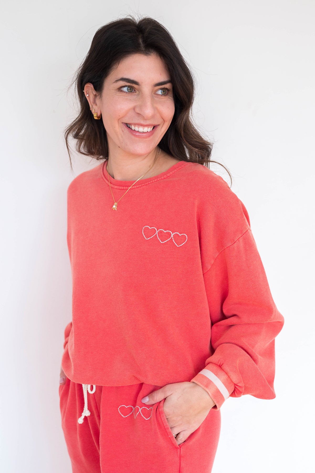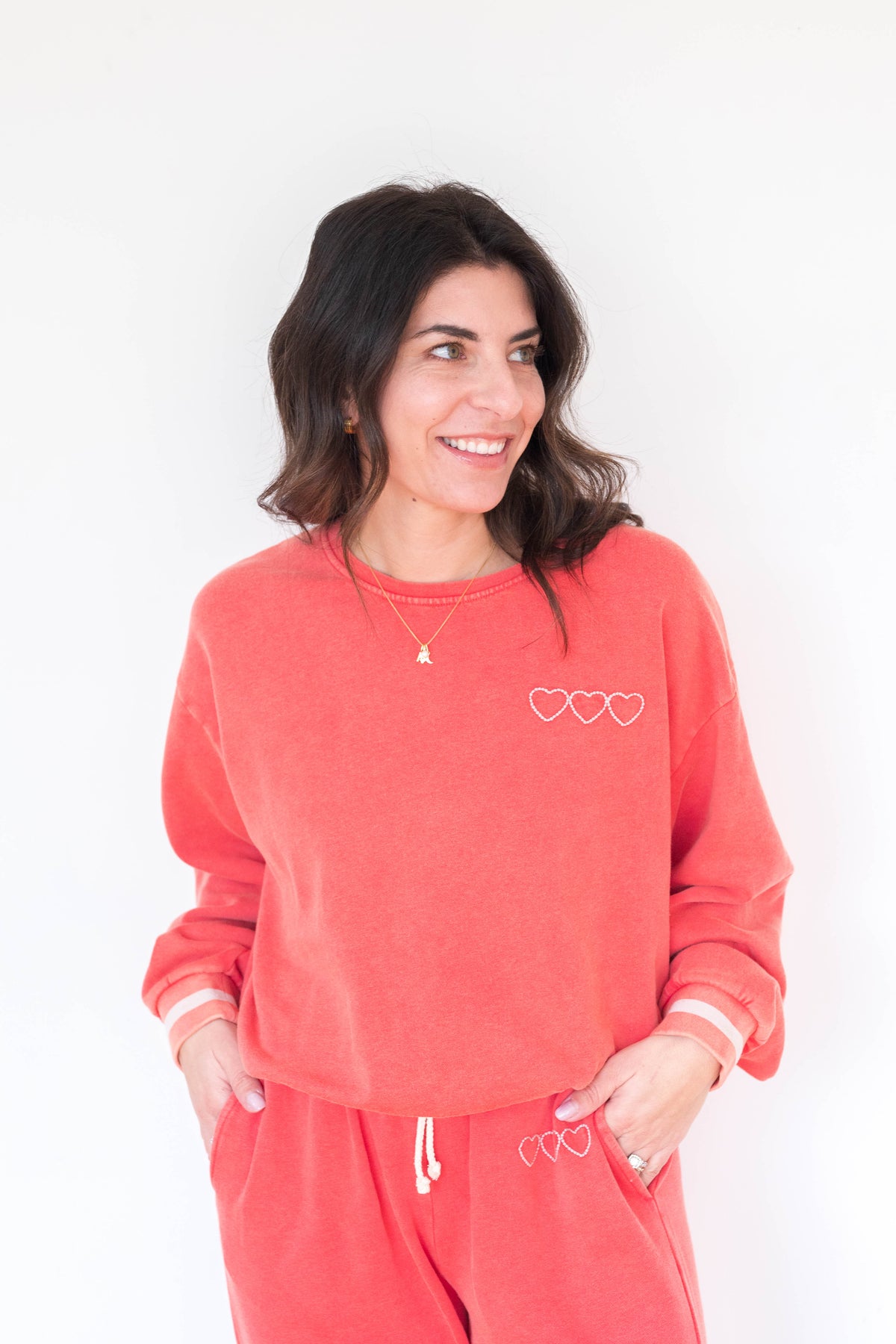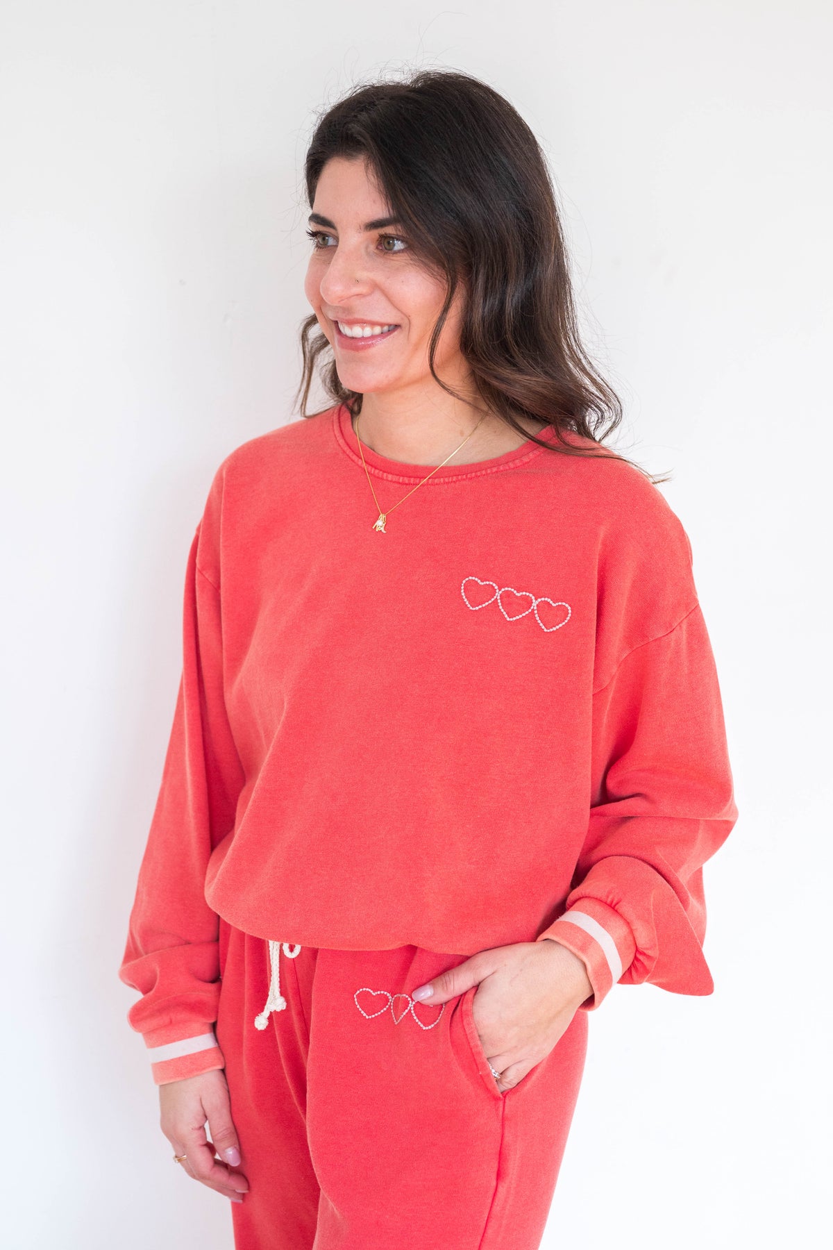 The Perry Vintage Red Pullover blends classic style with subtle details, featuring striped cuffs and petite heart detailing at the bodice.