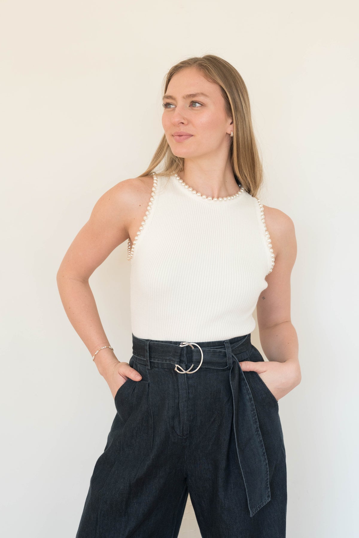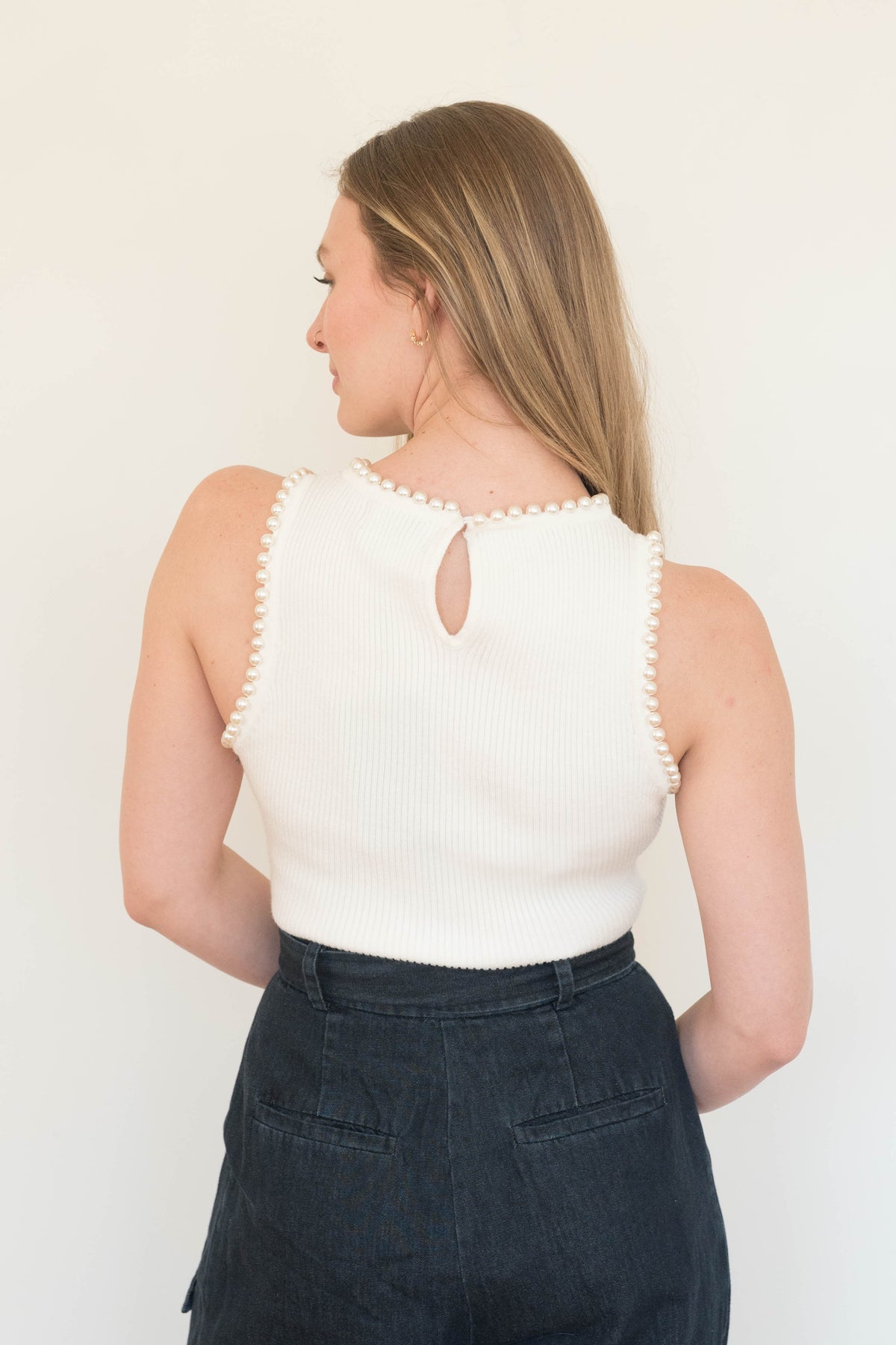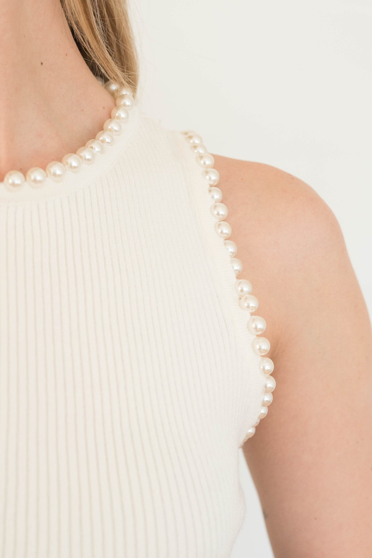 date night or girls night out, the rose knit bodysuit is a ribbed material embellished with pearls, perfect for dinner + drinks.