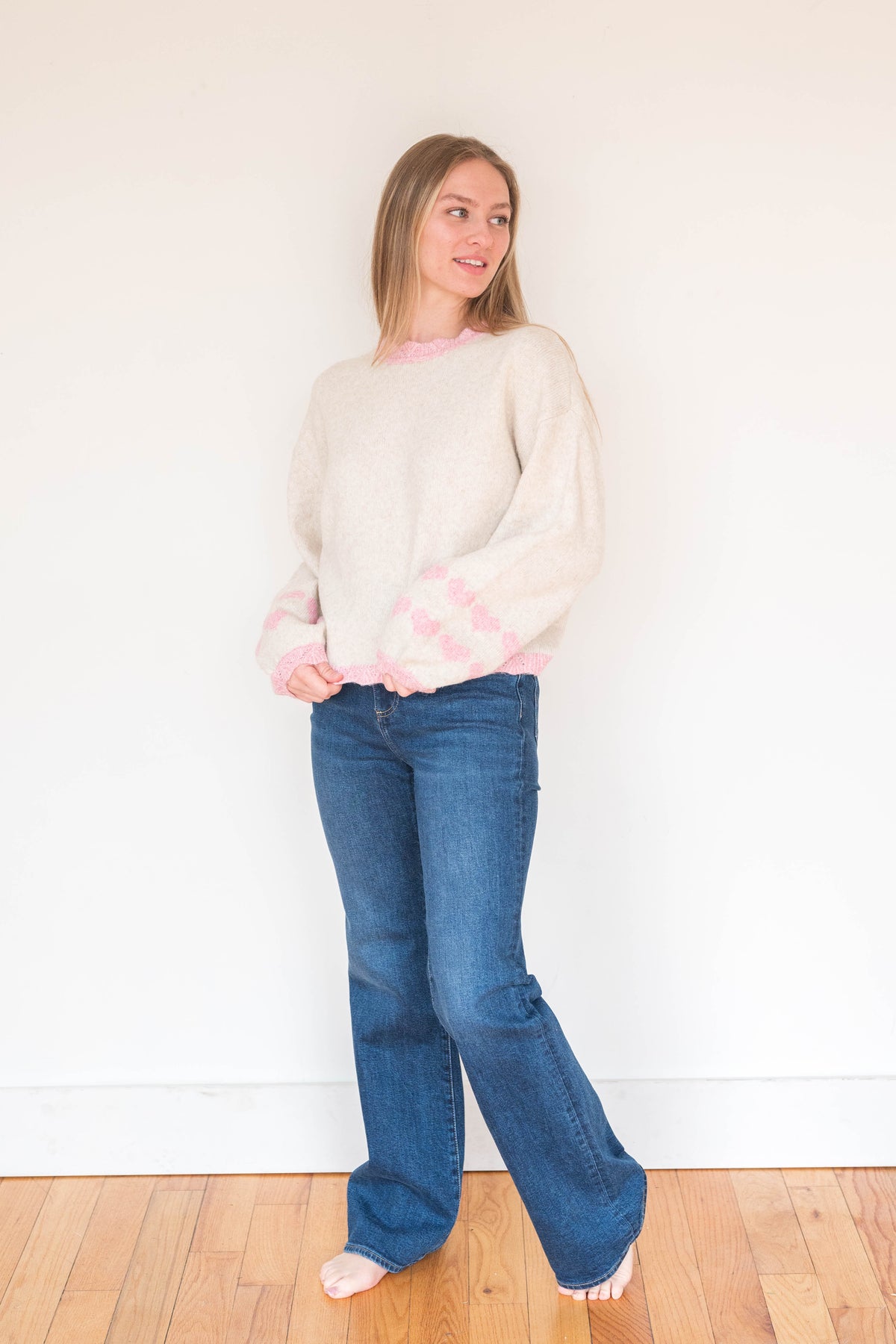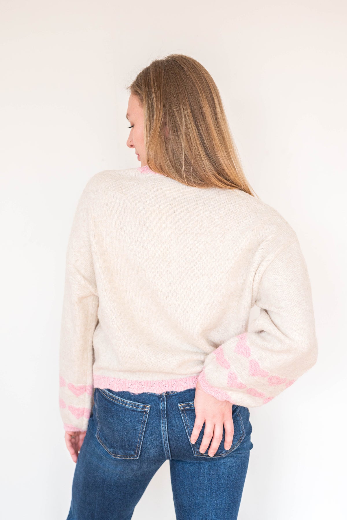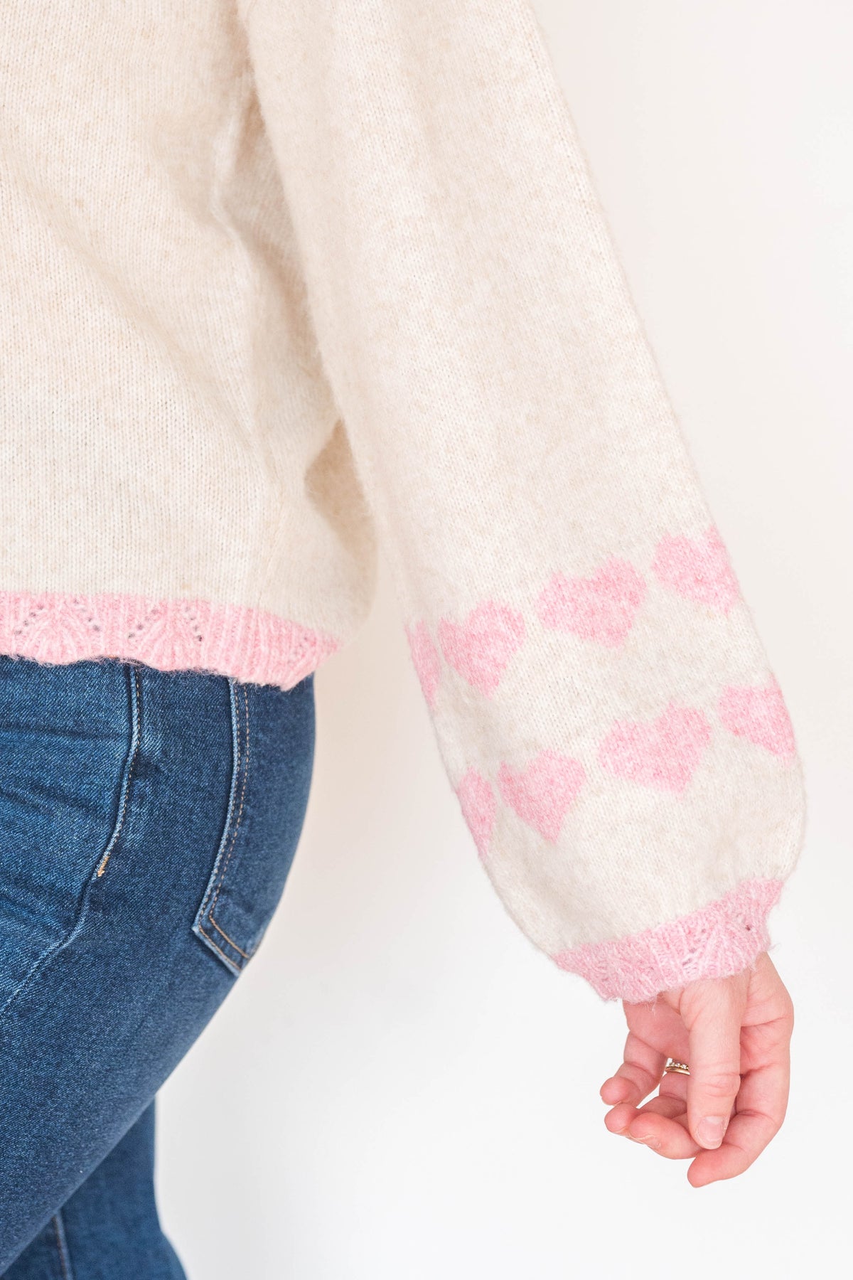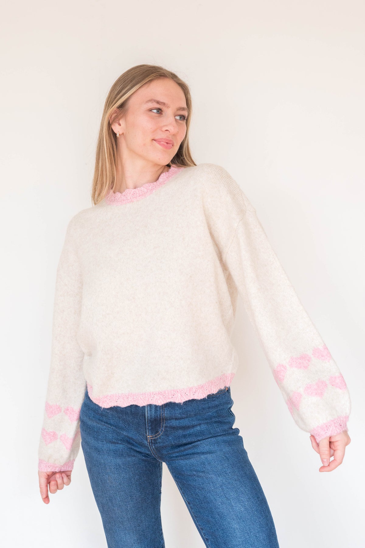 Crafted from soft oatmeal fabric, it showcases delicate scalloped detailing at the hem and petite pink hearts on the arms for a subtle touch of charm within a sophisticated silhouette.