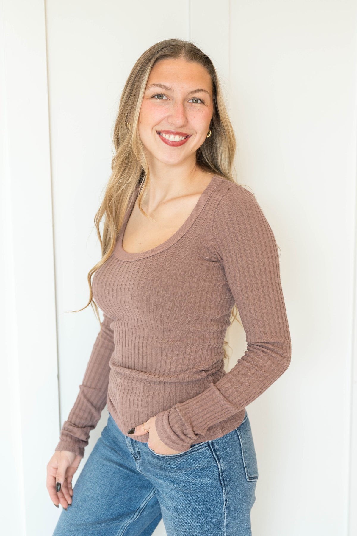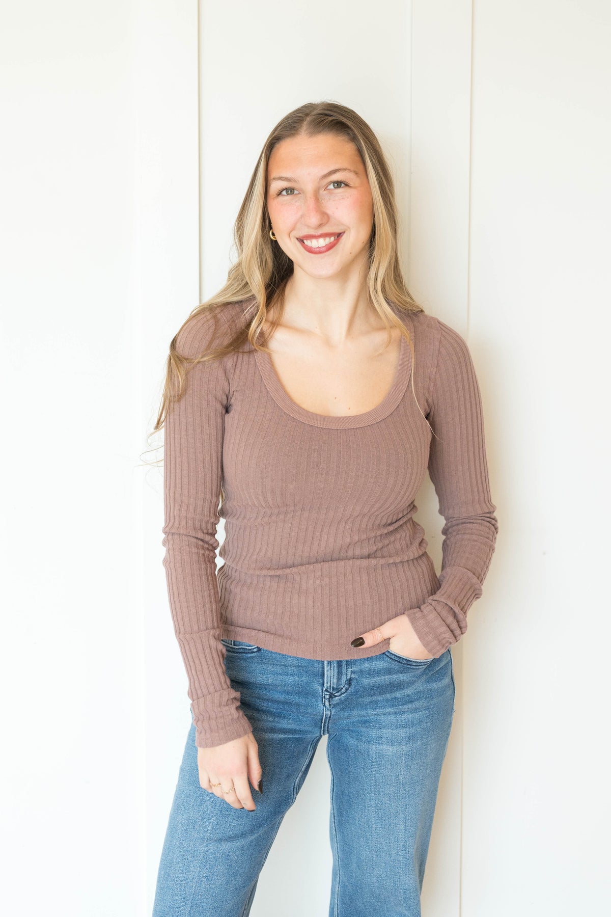 what's the scoop washed rib long sleeve is the perfect blend of fashion and comfort, thanks to our iconic sweater rib fabric and washed-dye technique. The wide rib fabric, scoop neck, and fitted silhouette keep this long sleeve looking tailored while still feeling comfy.