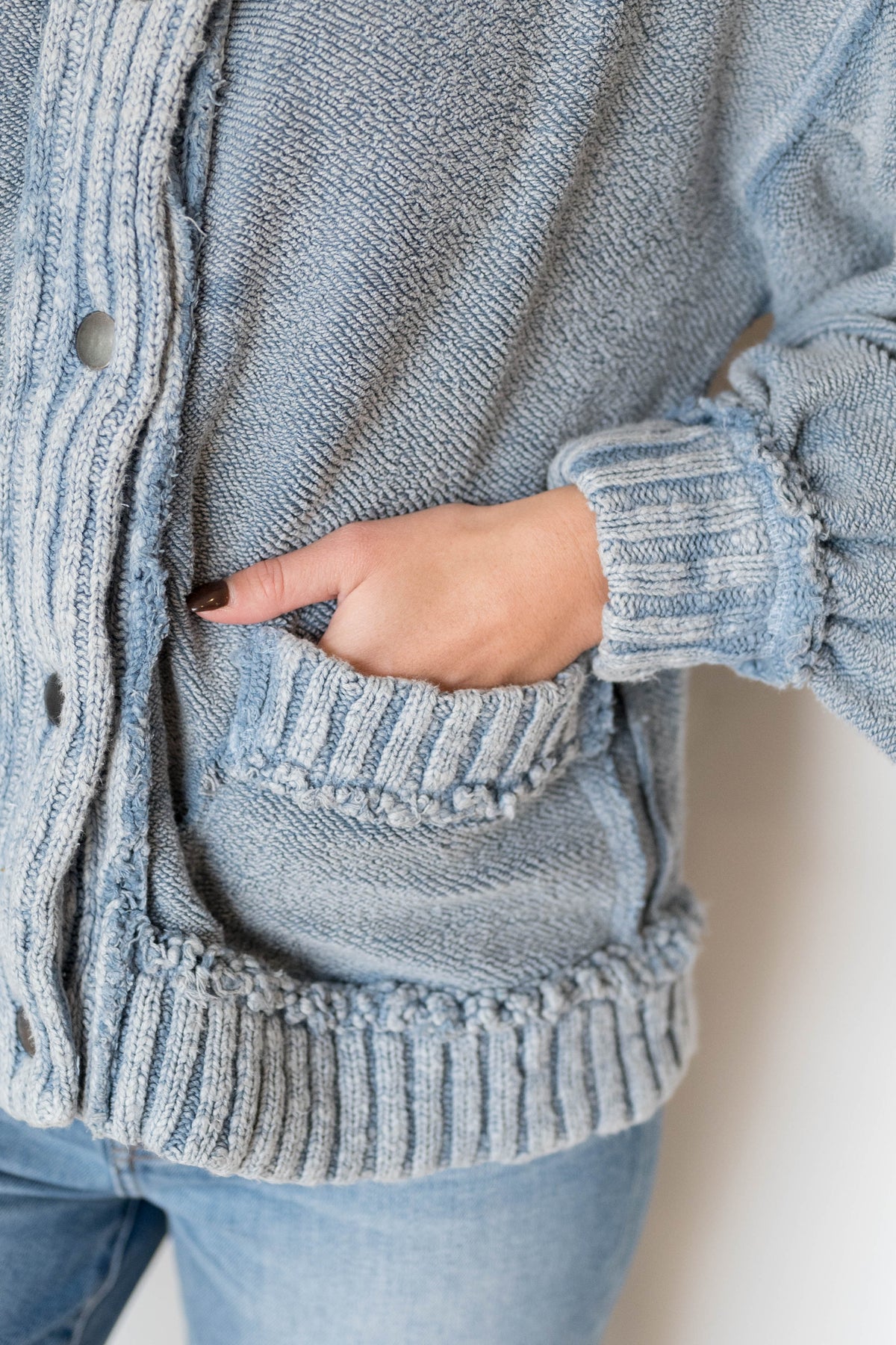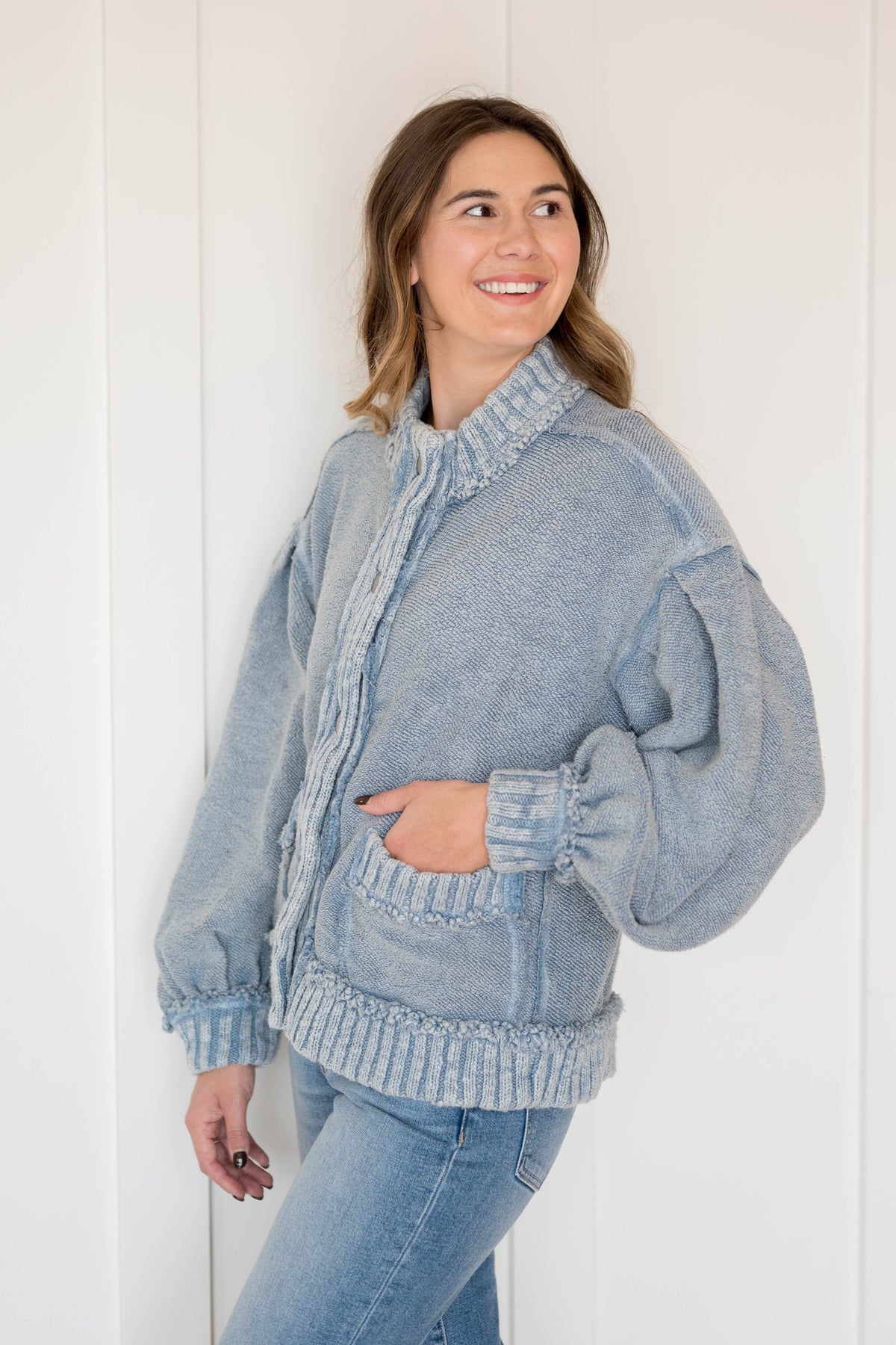 Features: Soft cotton terry, drop-shoulder sleeves with cuffs, button closures, ribbed knit trim, patch pockets at front, defined seams