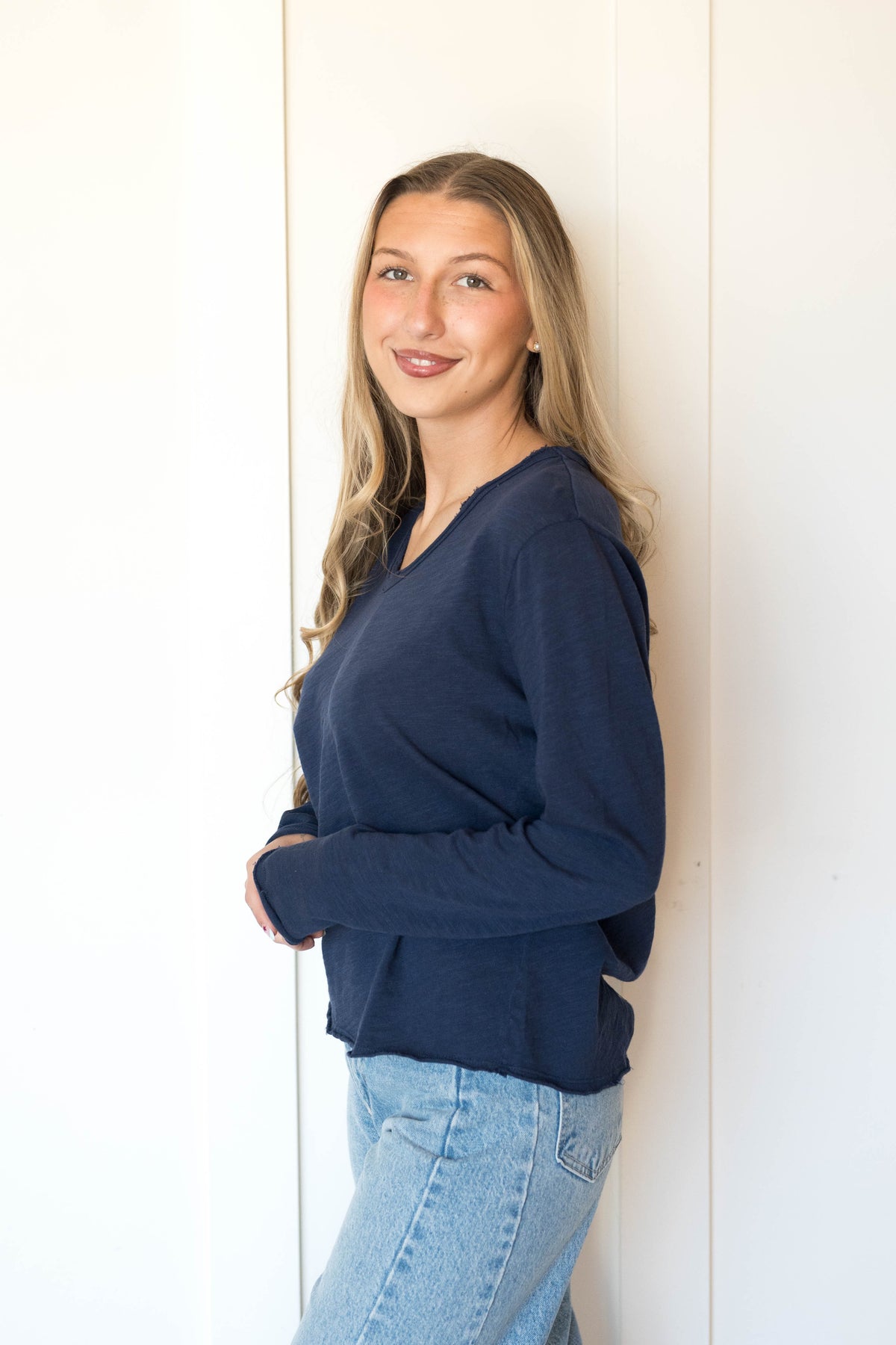 This versatile top features a flattering V-neckline and chic raw edge details, creating an effortlessly modern aesthetic perfect for any occasion.